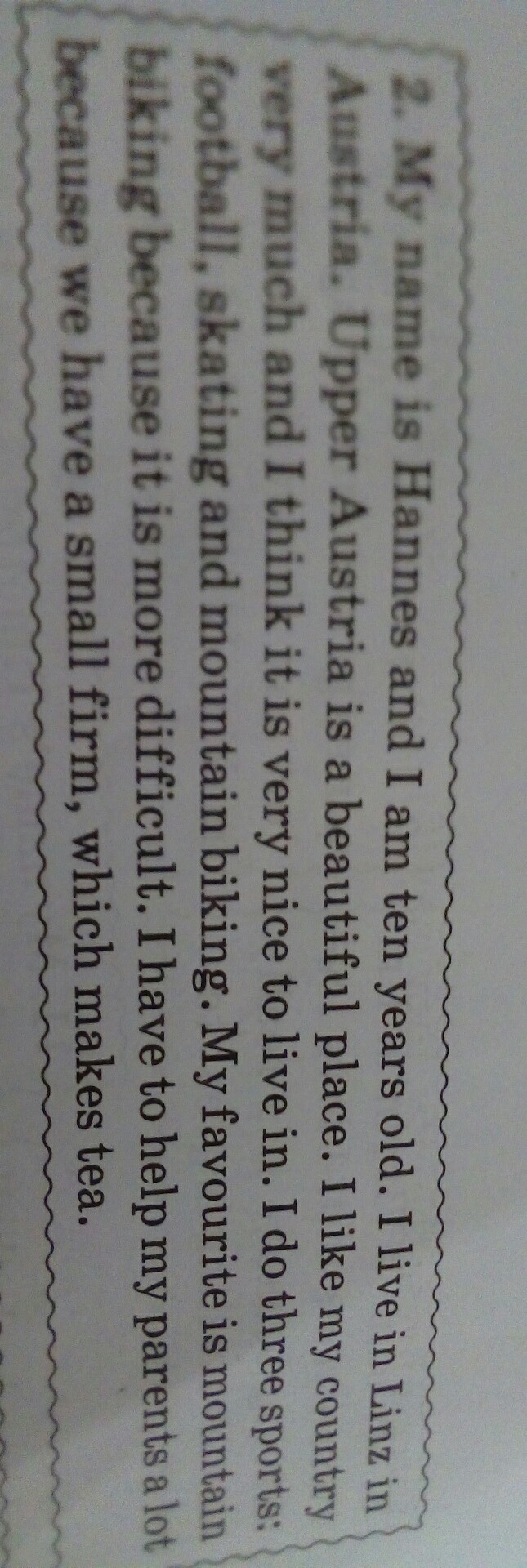 Меня зовут Ханнес и мне десять лет. Я живу в Линце в Австрии. Верхняя Австрия - прекрасное место. Мне очень нравится моя страна, и я думаю, что мне очень хорошо здесь жить. Я занимаюсь тремя видами спорта: футболом, коньками и горными велосипедами. Моим фаворитом является катание на горных велосипедах, потому что это сложнее. Я должен много помогать родителям, потому что у нас небольшая фирма, которая готовит чай.
