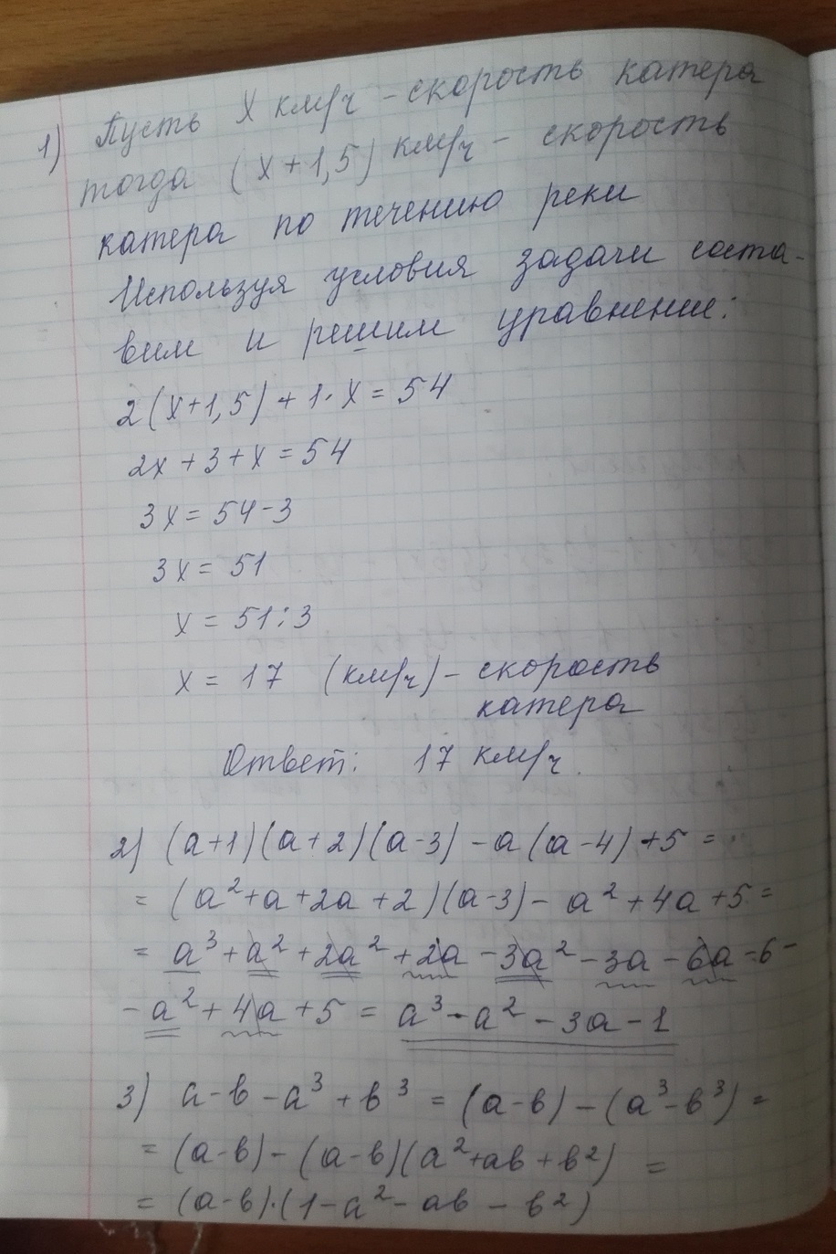 1. Катер плыл 2 ч по течению реки, а затем 1 ч по озеру и всего проплыл 54 км. Какова собственная скорость катера, если скорость течения реки 1,5 км/ч?