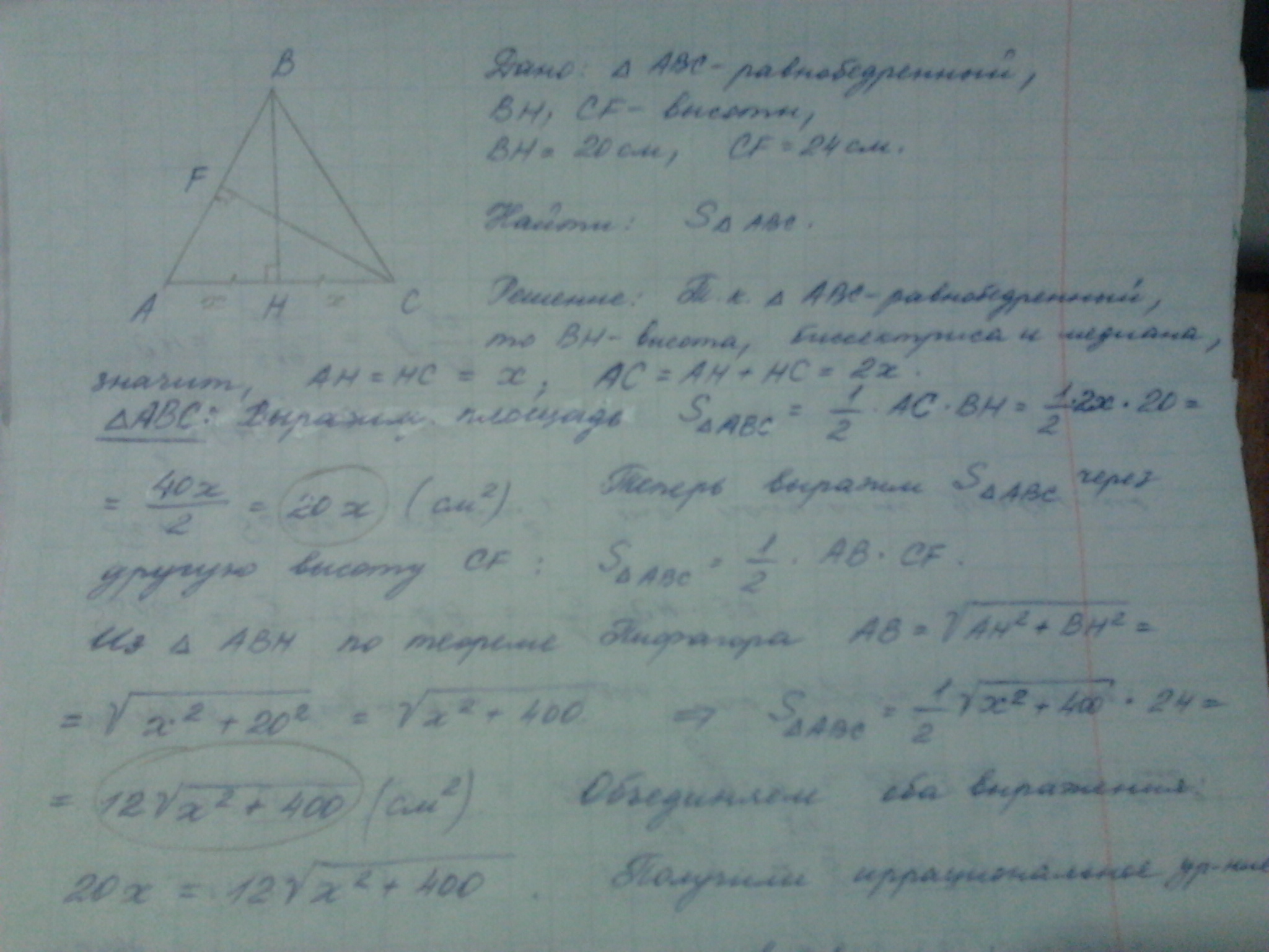 равна 20 см, а высота, проведенная к боковой стороне, — 24 см. Найдите