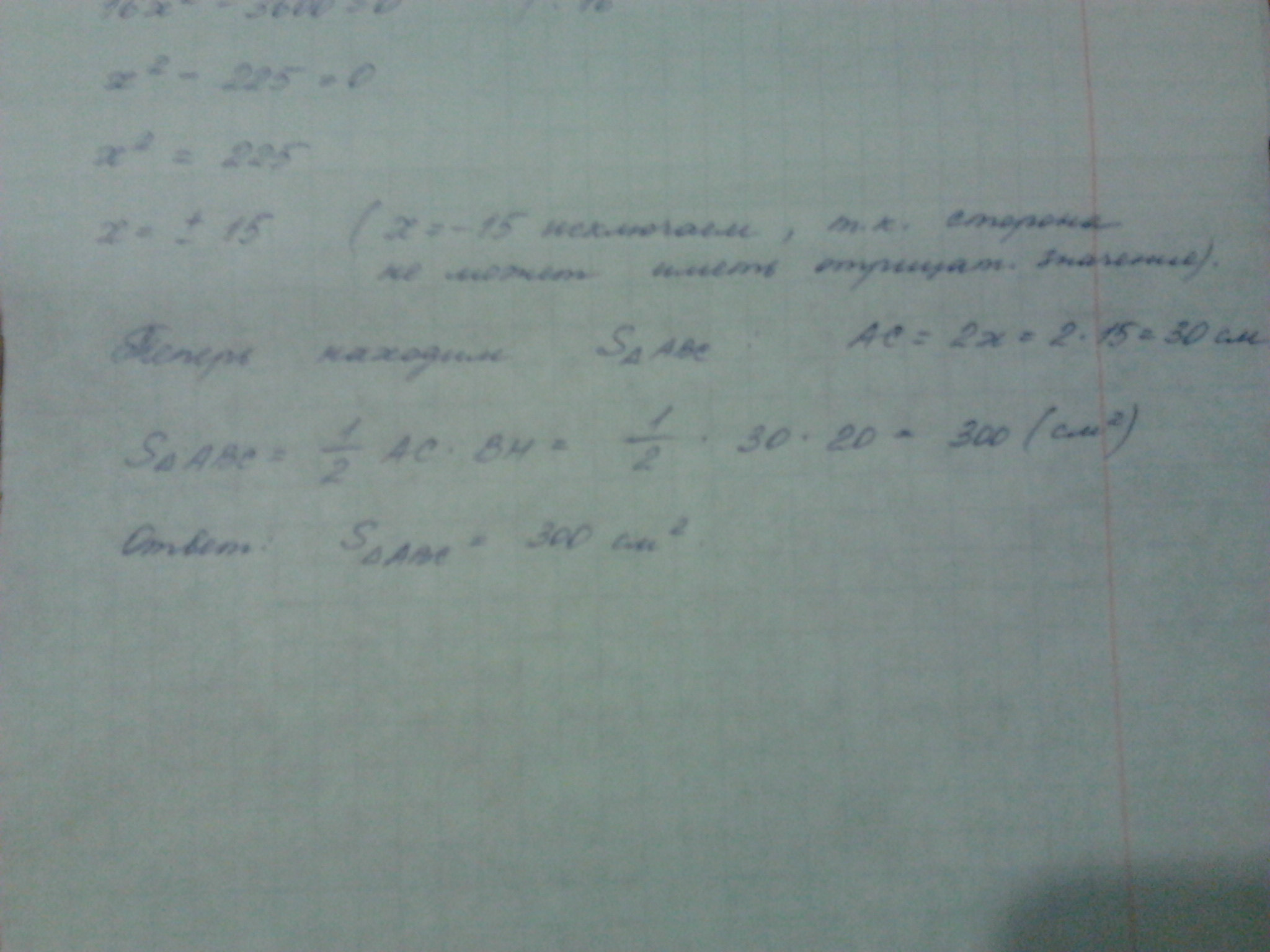 Площадь ΔАВС выражаем через обе высоты отдельно, потом полученные выражения объединяем. Получаем иррациональное уравнение, решая которое, находим сторону АС. Затем уже определяем площадь ΔАВС.