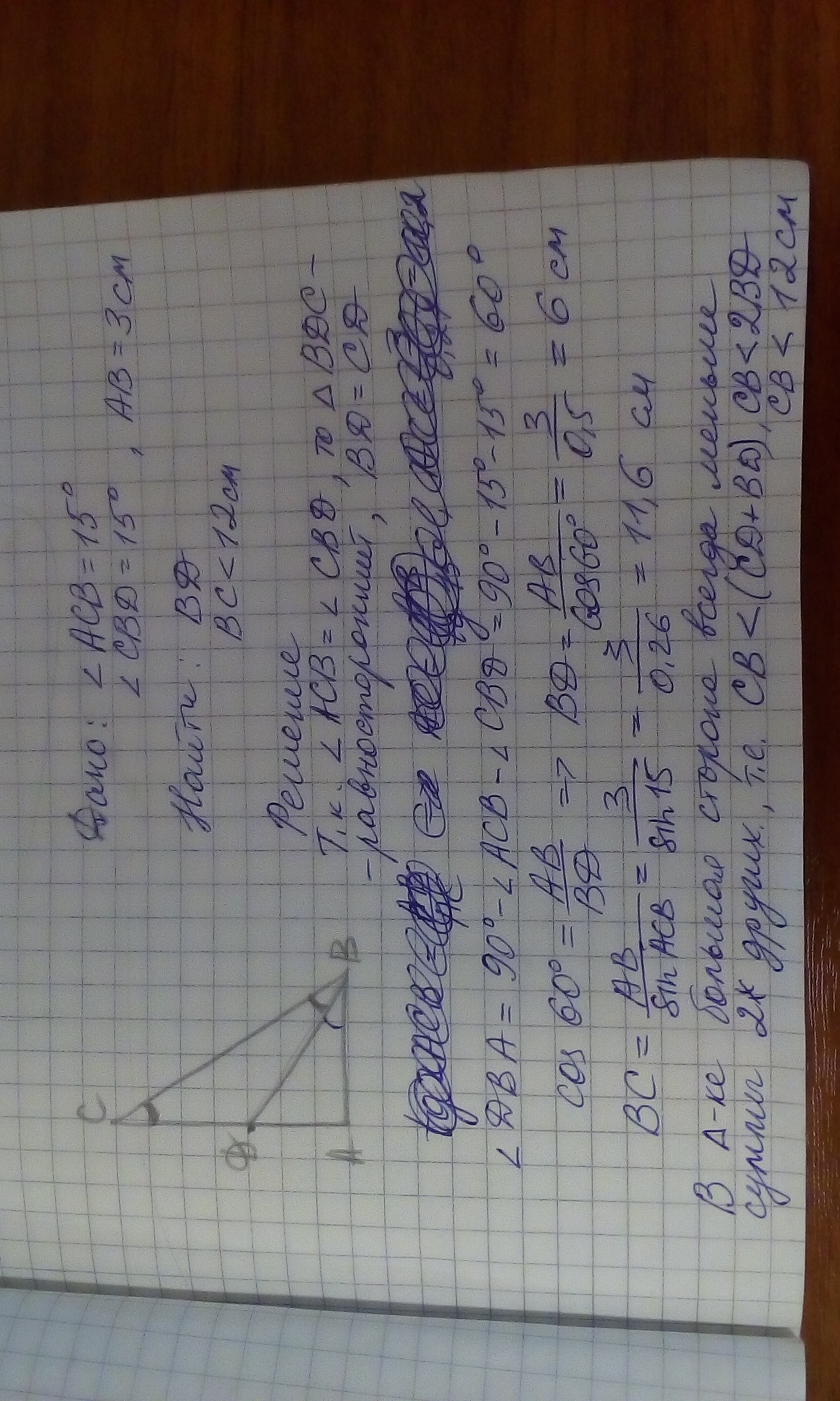 В прямоугольном треугольнике АВС, катет АВ=3см , Угол С равен 15гр., На катете АС- точка D , так ,что угол СВD=15гр.