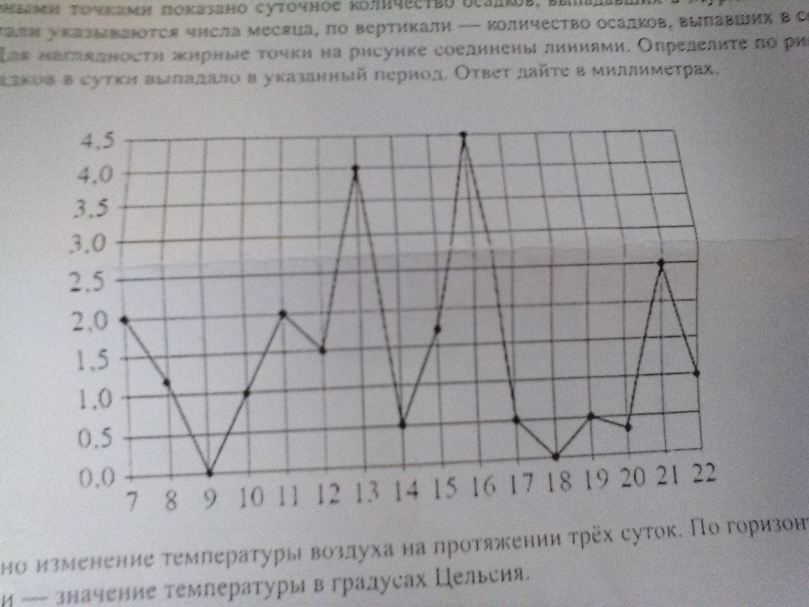 На рисунке жирными точками показано суточное количество осадков, выпавших в Мурманске с 7 по 22 ноября 1995 года. По горизонтали указываются числа месяца, по вертикали количество осадков выпавших соответствующий день в миллиметрах. Для наглядности жирные точки на рисунке соединены линиями. Определите по рисунку Какое наибольшее количество осадков в сутки выпало в указанный период. Ответ дайте в миллиметрах.