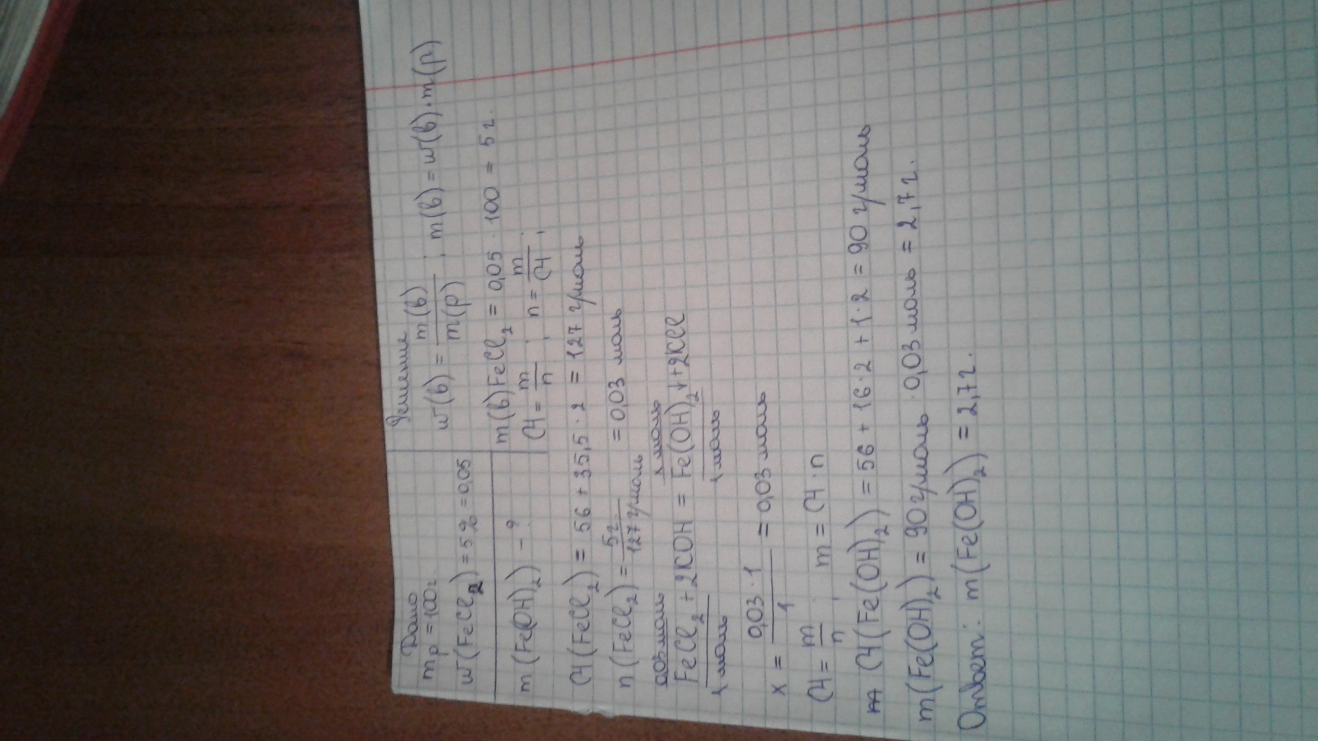 Какая масса осадка образуется при взаимодействии 100г 5% раствора хлорида железа (11) с избытком гидроксида калия?