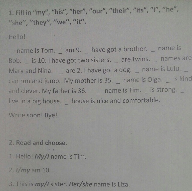 My name is Tom. l am 9.I have got a brother.His name is Bob.He is 10.l have got two sisters.They are twins.They names are Mary and Nina.Their are 2.I have got a dog.Its name is Lulu.It can run and jump.My mother is 35.Her name is Olga.She kind and clever.My father is 36.His name is Tim.He is strong.We live in a big house.Our house is nice and comfortable