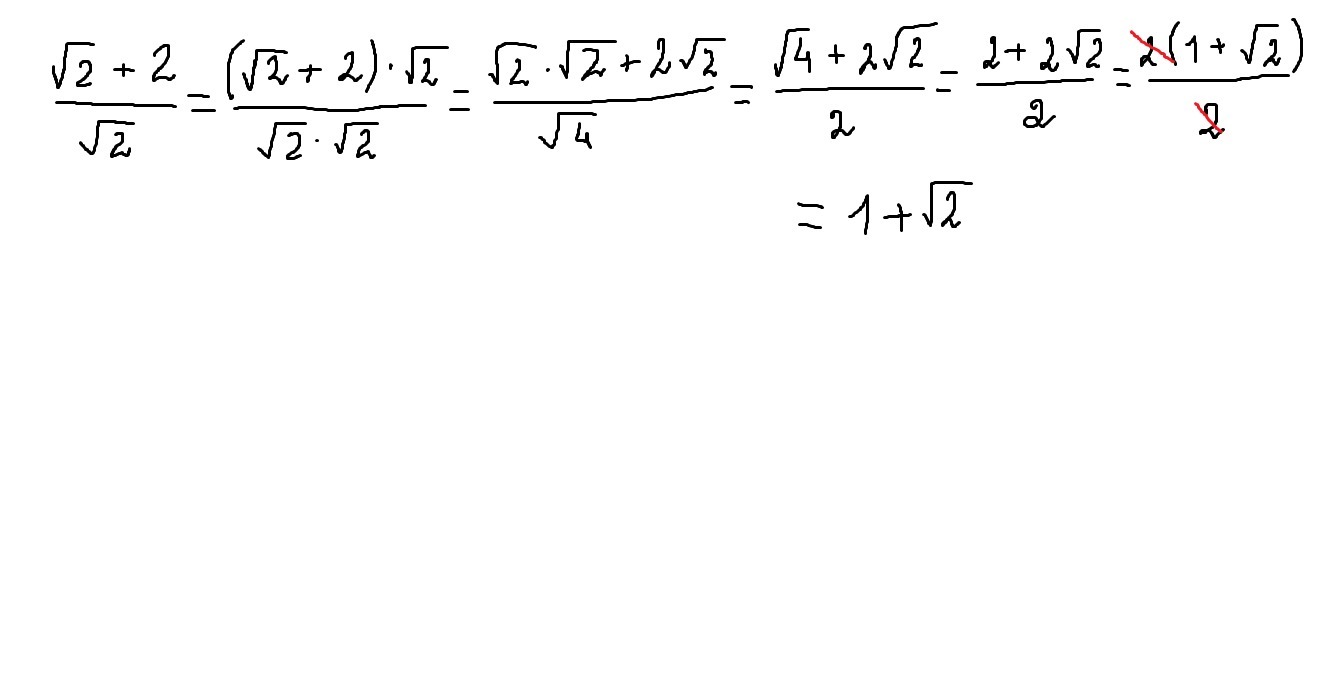 ( V 2 + 2 ) / ( V 2 ) = ( ( V 2 )( V 2 + 2 )) / ( V 2 )^2 = ( 2 + ( 2 V 2 )) / 2 = 1 + V 2