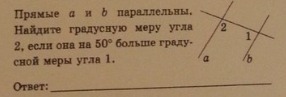 Прямые a и b параллельны.Найдите градусную меру угла 2,если на 50 градусов больше градусной меры угла 1