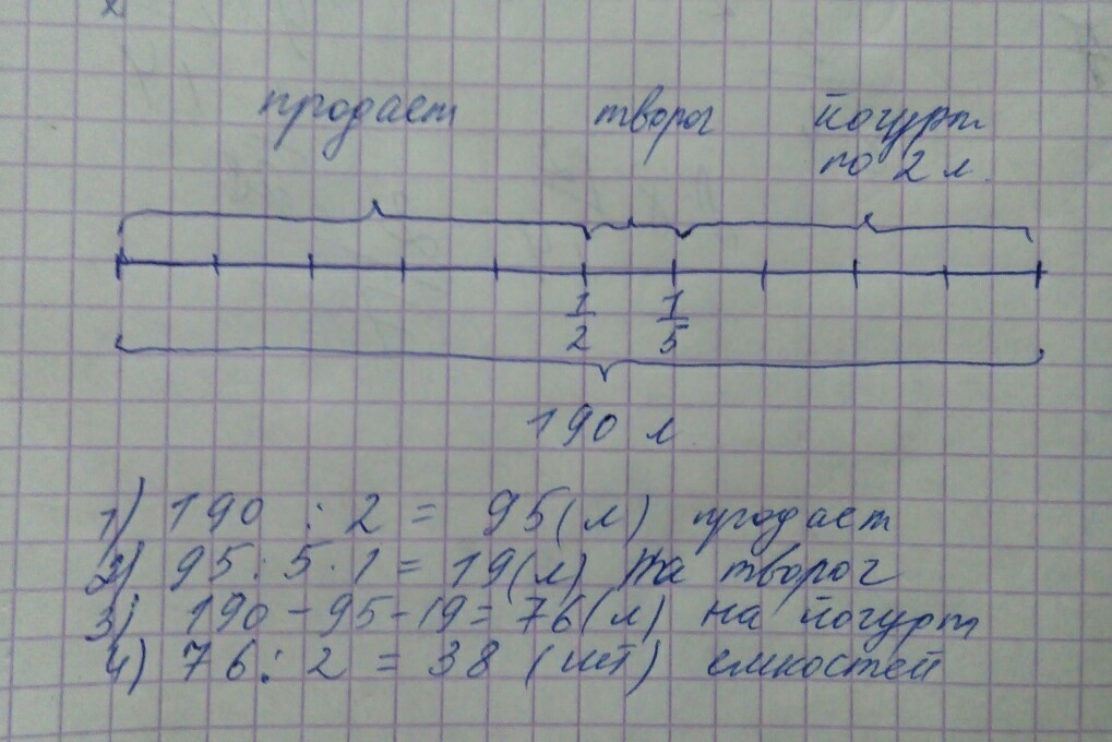 Фермер за день получает 190 л молока.Половину этого он продает,пятую часть оставшегося молока использует для получения творога,а из оставшейся части готовит йогурт в емкостях по 2 л.Сколько емкостей для йогурта понадобиться?Изобразить задачу графически,ресунком и реши ее.