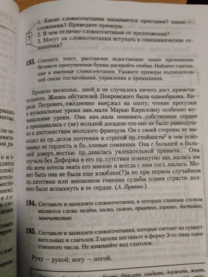 Не была влюблена еще ( примыкание, глагольное), при первом препятствии ( согласование,именное), случайном препятствии ( соглас., именное). внезапном гонении ( согласование, именное), гонении судьбы ( управление, именное), пламя страсти ( управление, именное), должно было вспыхнуть в сердце ( глагольное, управление), в ее сердце ( именное, согласование), несколько дней ( именное, согласование), не случилось достопримечательного ( именное, управление), жизнь обитателей ( именное, управление), обитателей Покровского ( управление, именное), выезжал ежедневно ( глагольное, примыкание) . выезжал на охоту ( управление. глагольное), музыкальные уроки( согласование, именное) , занимали Марью Кириловну ( управление, глагольное) ,начинала понимать сердце - управление, глагольное, собственное сердце - согласование, именное, признавалась с досадою - глагольное, управление, с невольной досадою - согл., именное. не было равнодушно к достоинствам - управл., глагольное, к достоинствам француза - именное, управление, со своей стороны - именное, согласование, молодого француза - именное, согласование, не выходил из пределов - управление, глагольное, из пределов почтения - управление, именное, строгой пристойности - согласование, именное, успокаивал тем - управление, глагольное, успокаивал гордость - управление, глагольное, ее гордость - управление, глагольное, боязливые сомнения- согласование, именное, с большей доверчивостью - согласование, именное, меньшей доверчивостью - согласование , предавались привычке - глагольное, управление, увлекательной привычке - согласование, именное, скучала без Дефоржа - управление, глагольное, в его присутствии - согласование, именное, занималась поминутно - примыкание, глагольное, занималась им - управление, глагольное, обо всем хотела знать- глагольное, управление, его мнение - согласование, именное, соглашалась с ним - управление, глагольное, соглашалась всегда - глагольное, примыкание.