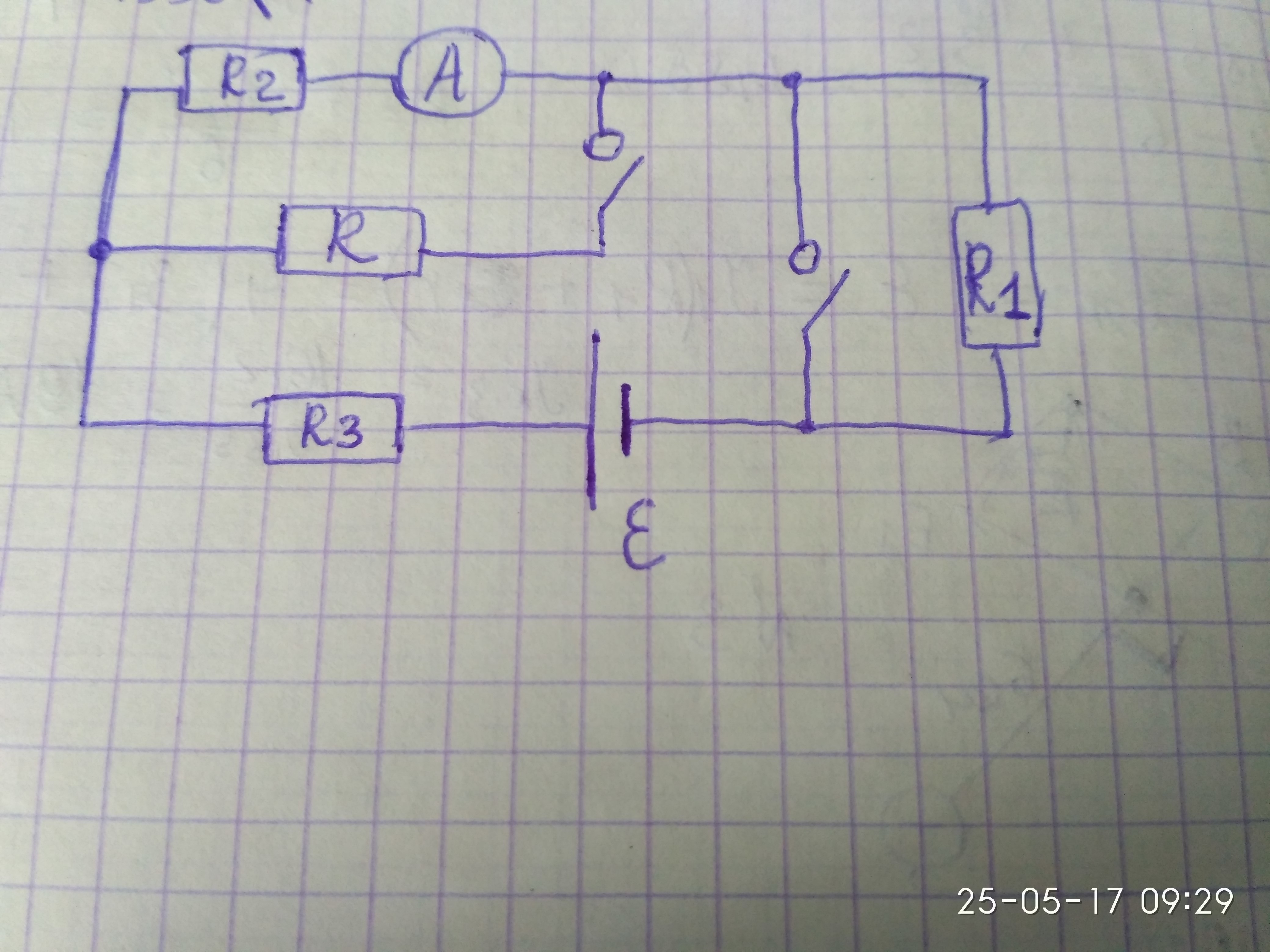 В цепи, схема которой показана на рисунке R1=50 Oм, R2=1000 Ом, R3=300 Ом, ЭДС(Е)=1,5 В. Показания амперметра одинаковы, когда оба ключа замкнуты и когда оба разомкнуты. Найдите сопротивление R.