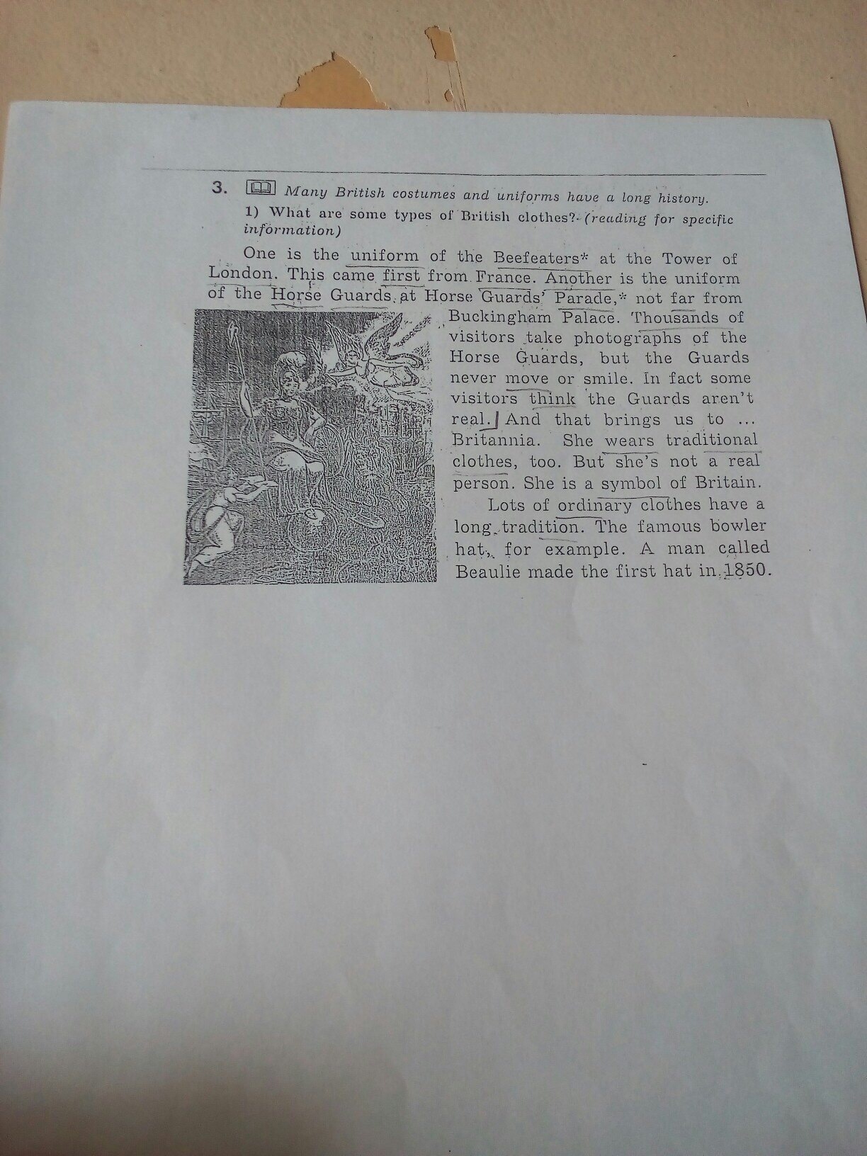 Один из видов униформы - униформа бифитеров (лейб-гвардейцев ( при английском дворе ) в лондонском Тауэре. Она первоначально пришла из Франции. Другая униформа - униформа конногвардейского полка на Конном Параде армии, недалеко от Букингемского дворца. Тысячи посетителей фотографируют конногвардейцев, но те не двигаются и не улыбаются. На самом деле, некоторые посетители думают, что гвардейцы - не настоящие. А это переносит нас к Великобритании (олицетворение Великобритании в виде женской фигуры на монетах и т. п.) Она тоже носит традиционную одежду. Но она не настоящий человек. Она - символ Британии.