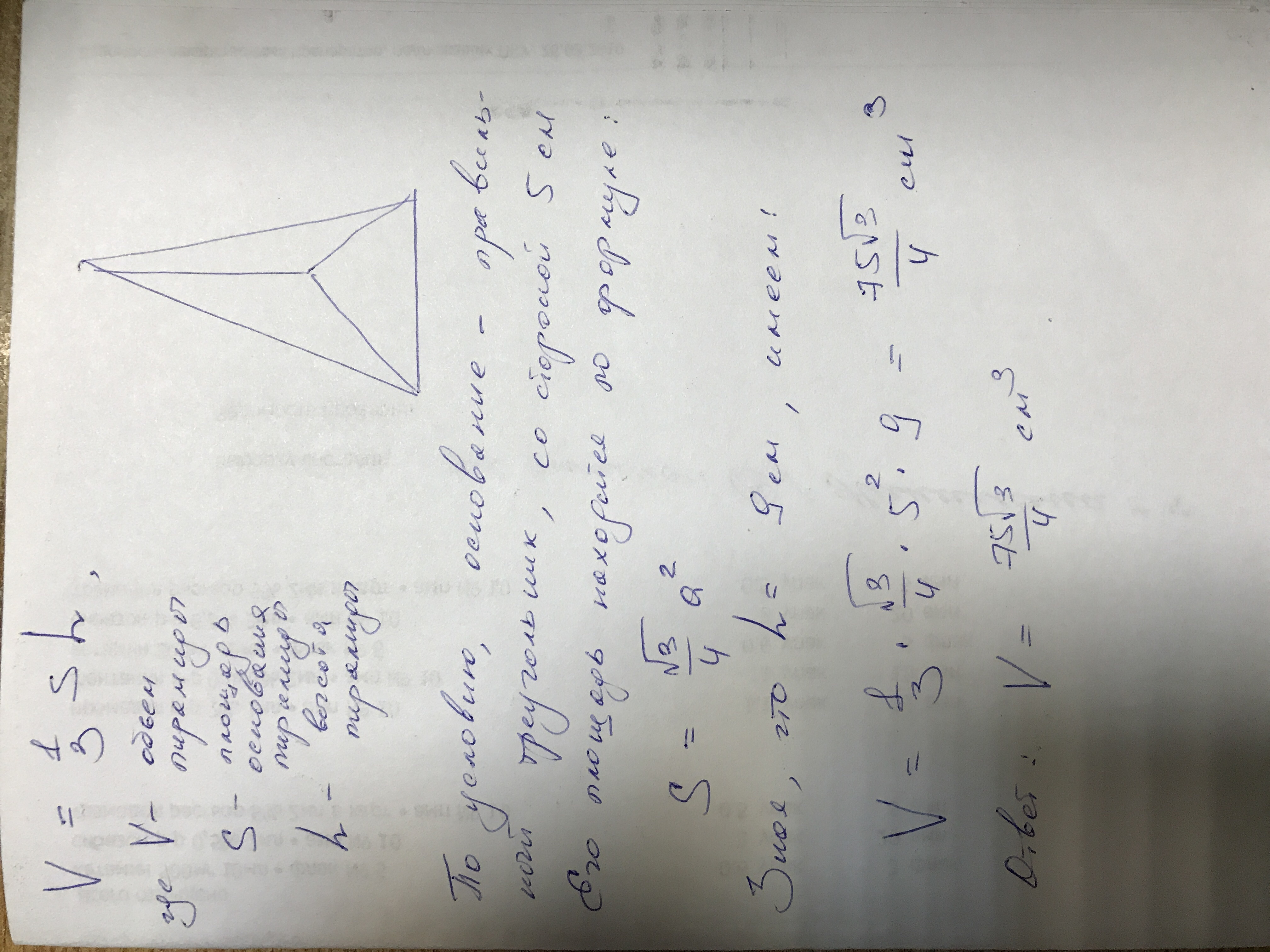 Знайти обєм піраміди з висотою 9 см, якщо в основі піраміди- правилльний трикутник зі стороною 5 см