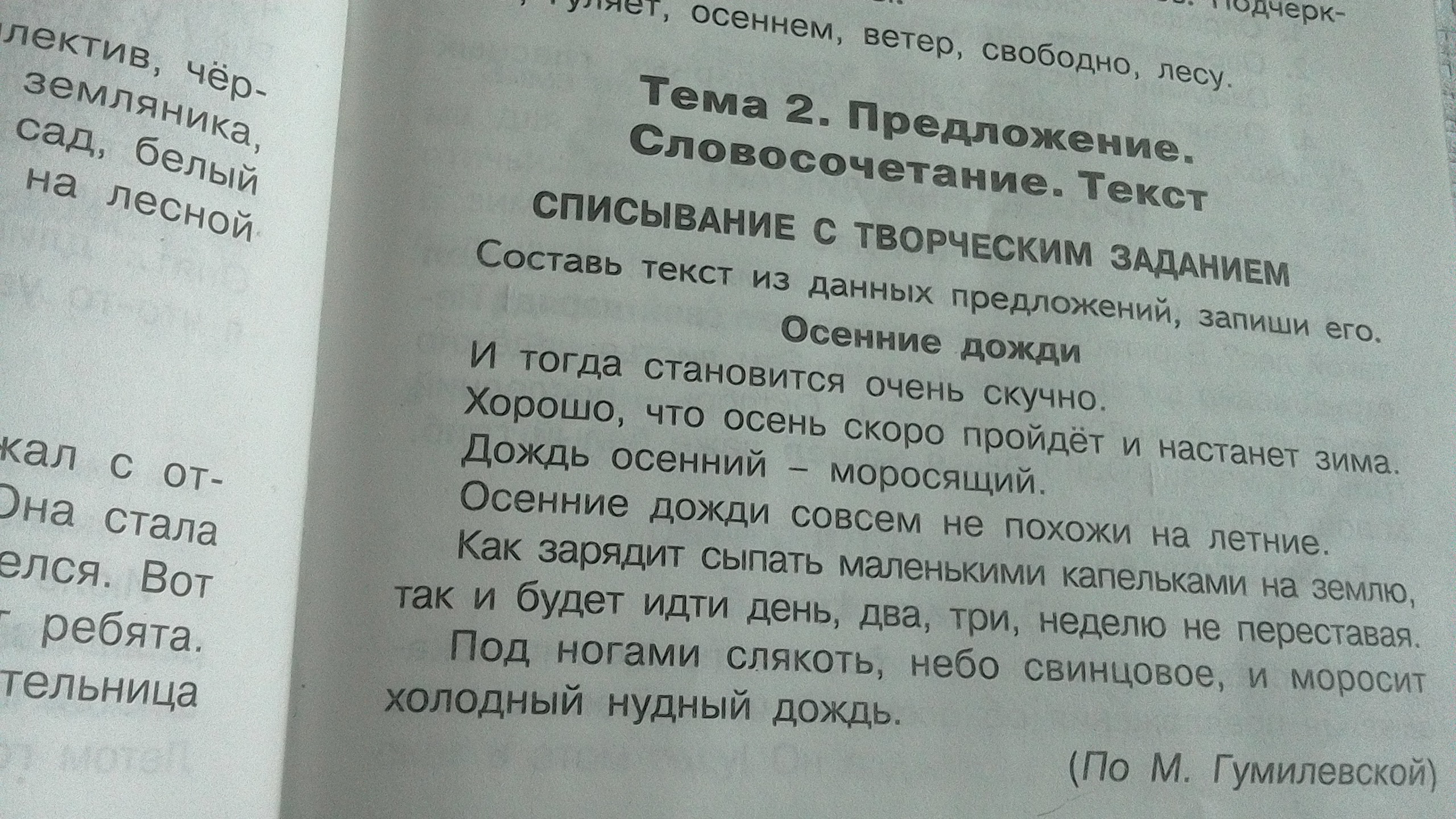 Хорошо,что осень скоро пройдет и настанет зима. Осенние дожди совсем не похожи на летние. Дождь осенний-моросящий. Как зарядит сыпать маленькими капельками на землю,так и будет идти день,два,три,неделю не переставая. И тогда становится очень скучно.Под ногами слякоть,небо свинцовое,и моросит холодный нудный дождь.