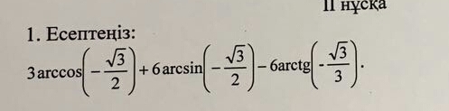3(Pi - arccos(sqrt(3)/2)) - 6arcsin(sqrt(3)/2) + 6arctg(sqrt(3)/3) = 3 (Pi - Pi/6) - 6*Pi/3 + 6*Pi/6 = 5Pi/2 - 2Pi + Pi = 5Pi/6 - Pi = -Pi/6