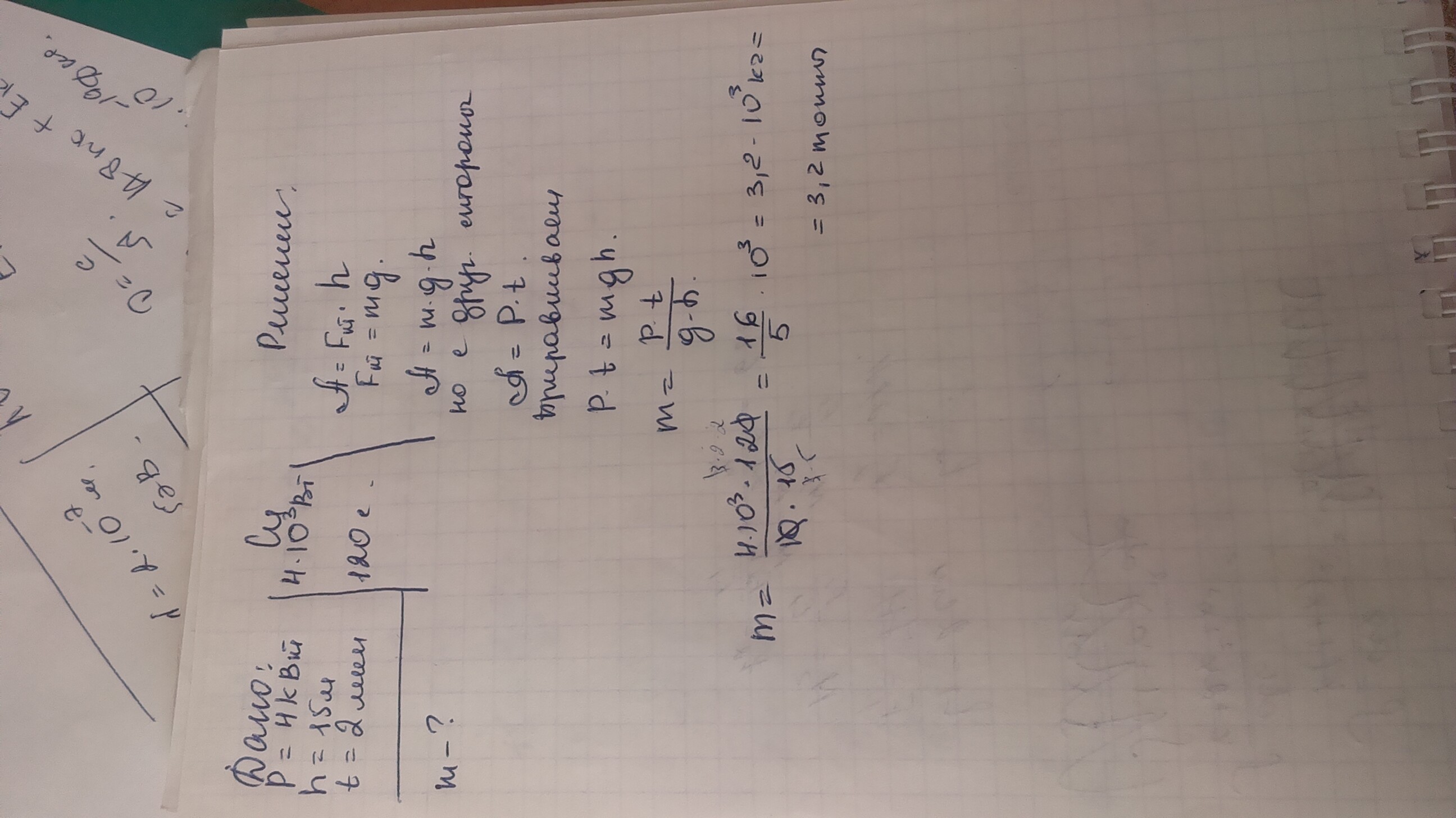 По образцу решите задачу: Мощность двигателя подъемной машины равна 4 кВт. Груз какой массы она может поднять на высоту 15 м в течение 2 мин.