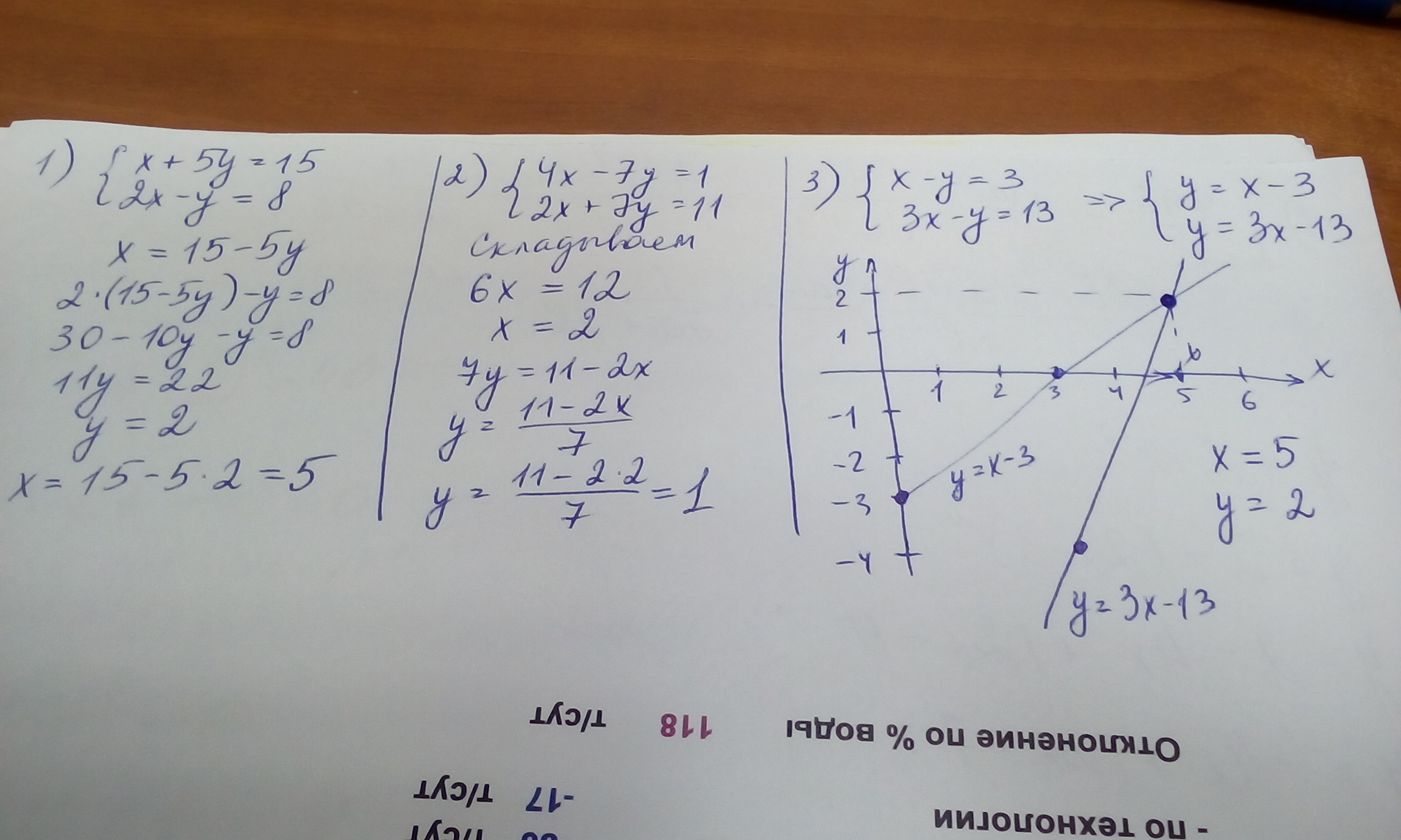 1) Решите линейное уравнение способом постановки: { x+5y=15