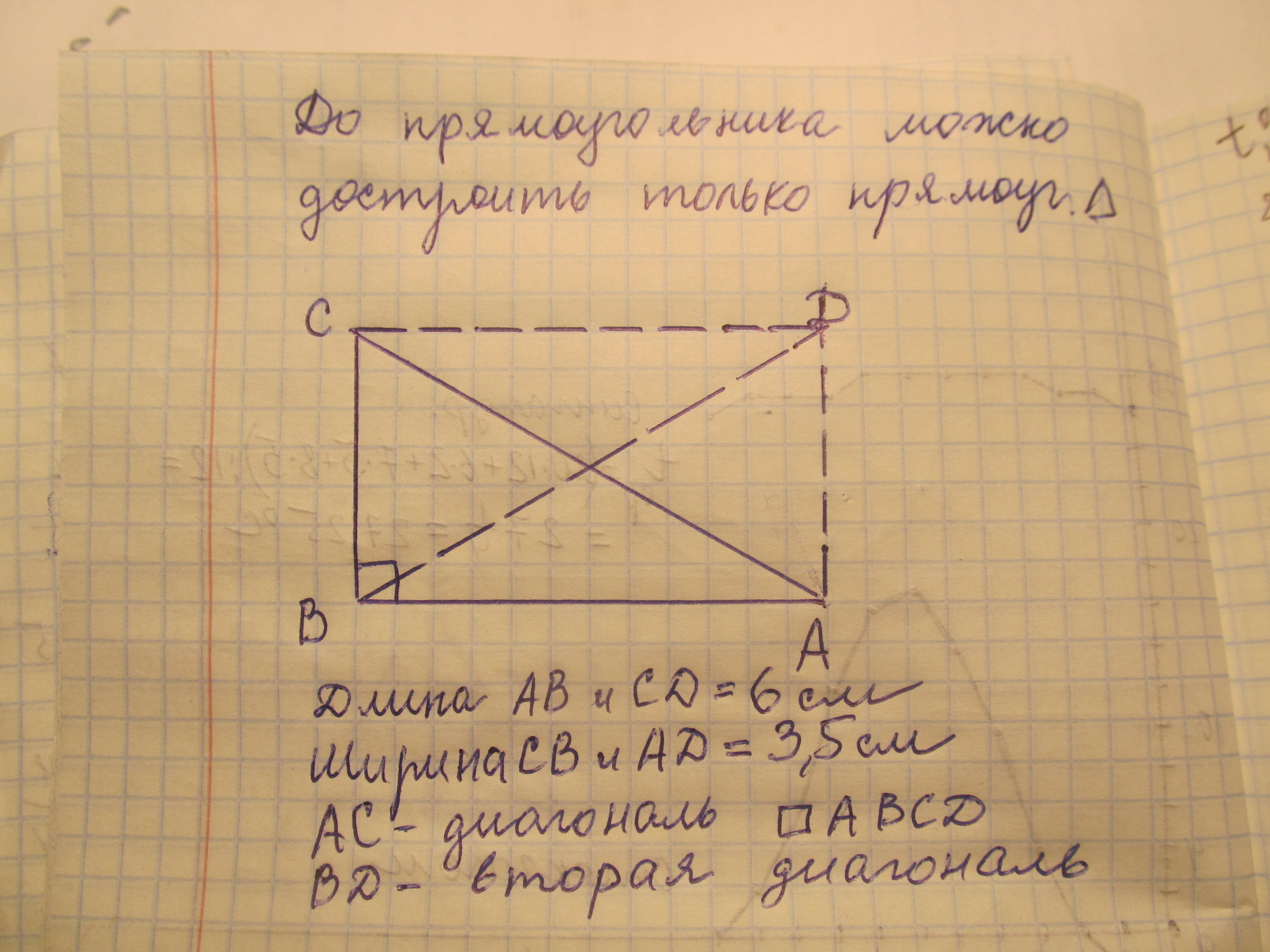 Дострой треугольник ABC до прямоугольника ABCD. выполни необходимые измерения и запиши,чему равны длины сторон прямоугольника.Как называется отрезок AC ? Проведи вторую диагональ прямоугольника!!!!!!