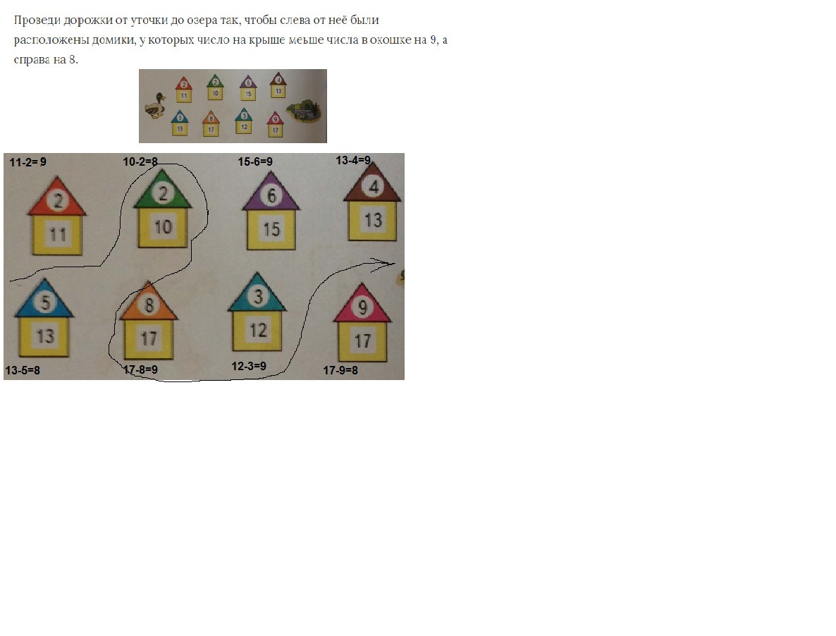 проведи дорожку от уточки до озера так,чтобы слева от нее были расположены домики.у которых число на крыше меньше числа в окошке на 9,а справа -на8 2 2 6 4 11 10 15 13 5 8 3 9 13 17 12 17