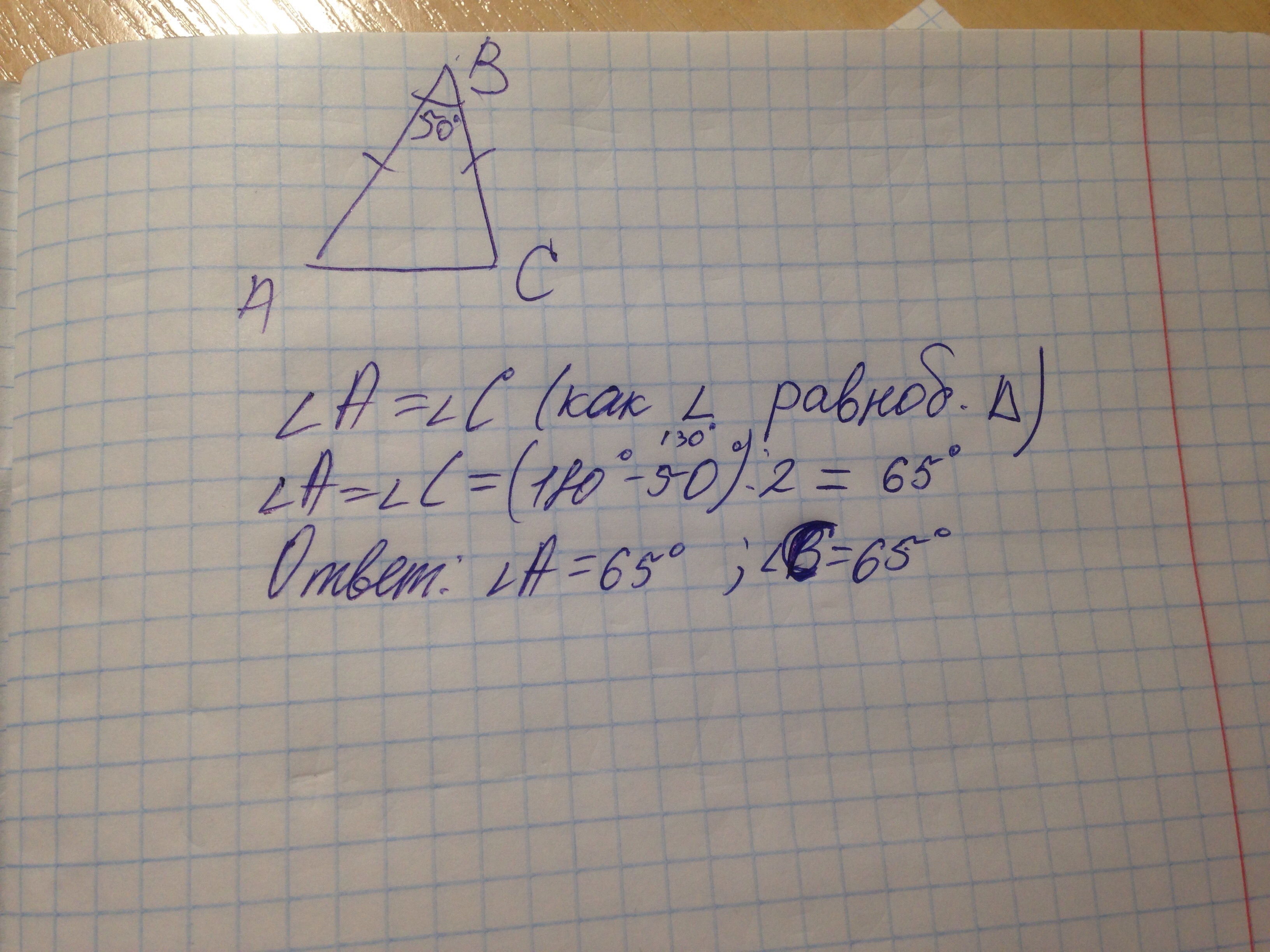 Помогите пожалуйста решить задачу по геометрии.Дано:треугольник АВС,АВ=СВ,угол В=50 градусов.Найти угол А,угол С
