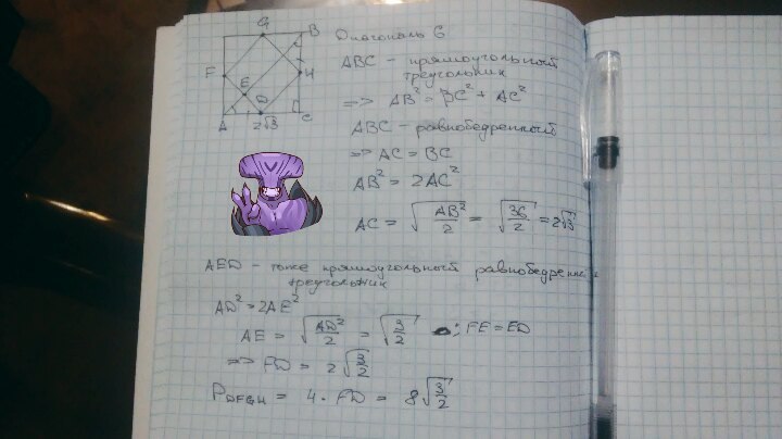 В квадрате с диагональю 6 см последовательно совместили середины его сторон. Найти периметр образованного четырёхугольника.