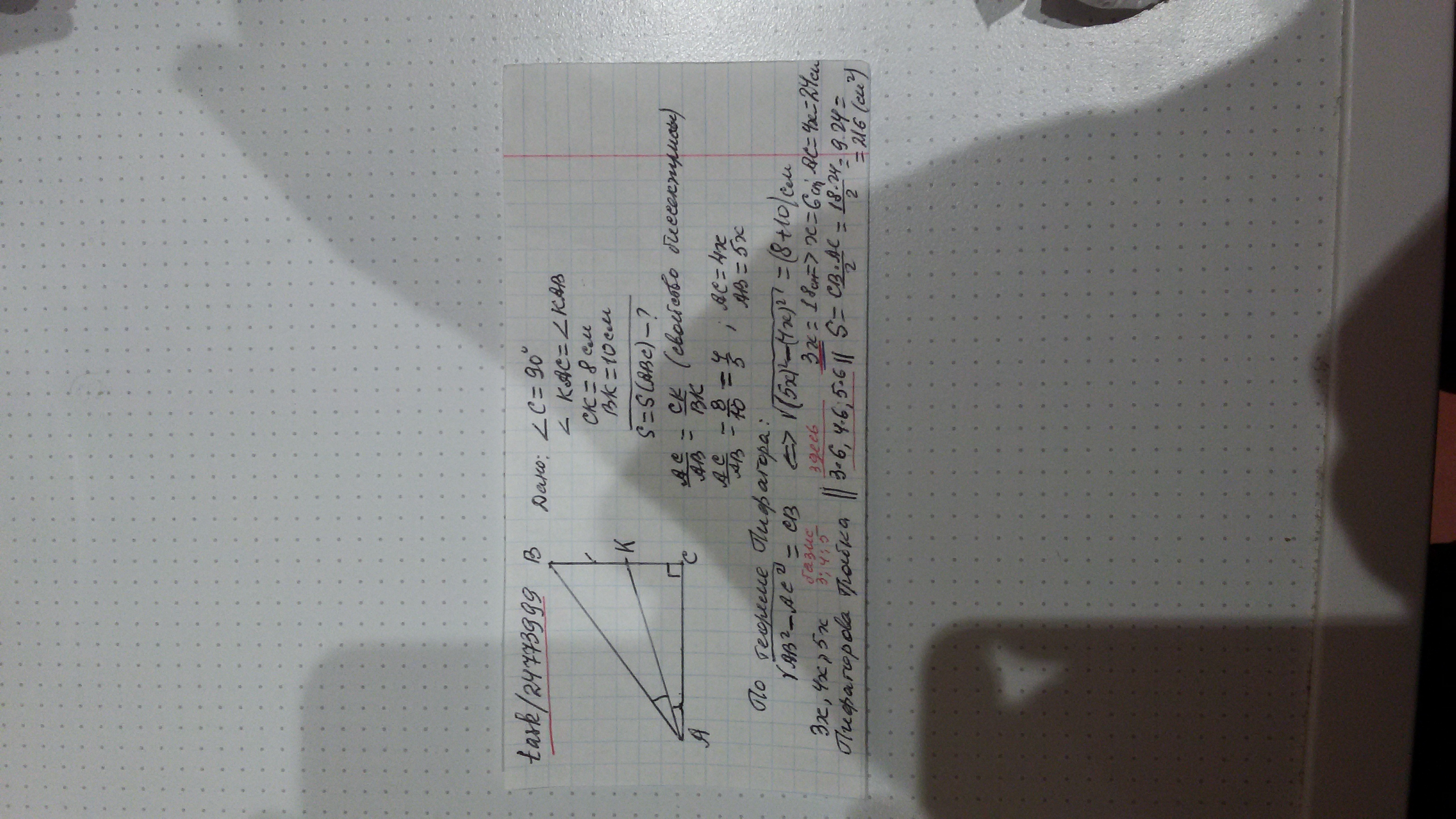Биссектриса делит противолежащую сторону на отрезки пропорцоинальные сторонамАВ гипотенуза,АК биссектриса, угол С=90тогда АC:AB=8:10=4:5Пусть АВ=5х, АС=4х, ВС=18По т. Пифагора 25x^2=16x^2+3249x^2=324x^2=36x1=6x2=-6 не подходитАС равно 4*6=24s равно 24*18/2 равно 216
