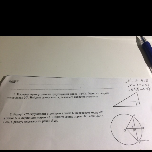 Площадь прямоугольного треугольника равна 18 корней из 3. Один из острых углов равен 30. Найдите длину катета, лежащего напротив этого угла.