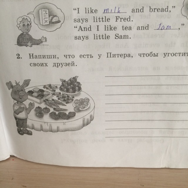 Peter has got four carrots, ten apples, five potatoes, six cakes, seven oranges, nine sweets and three tomatoes.