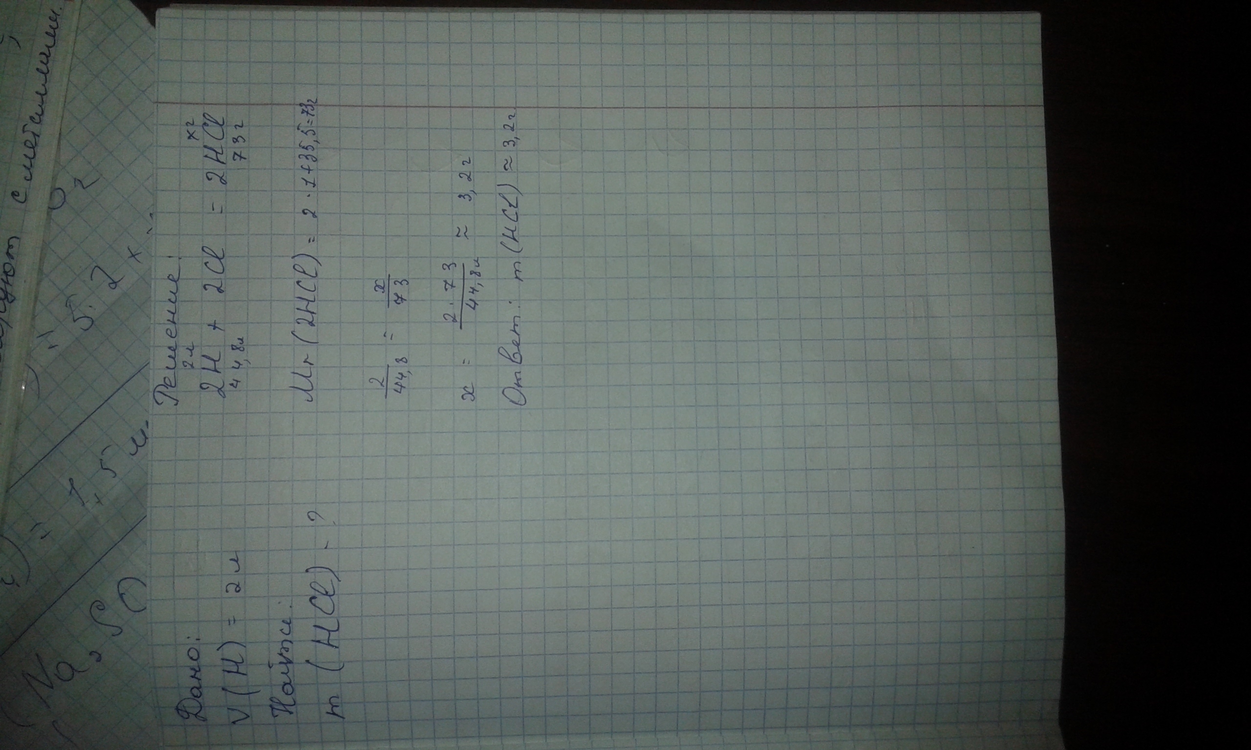Вычислите массу хлороводорода образованного взаимодействии 2 л водорода с хлором при нормальных условиях.