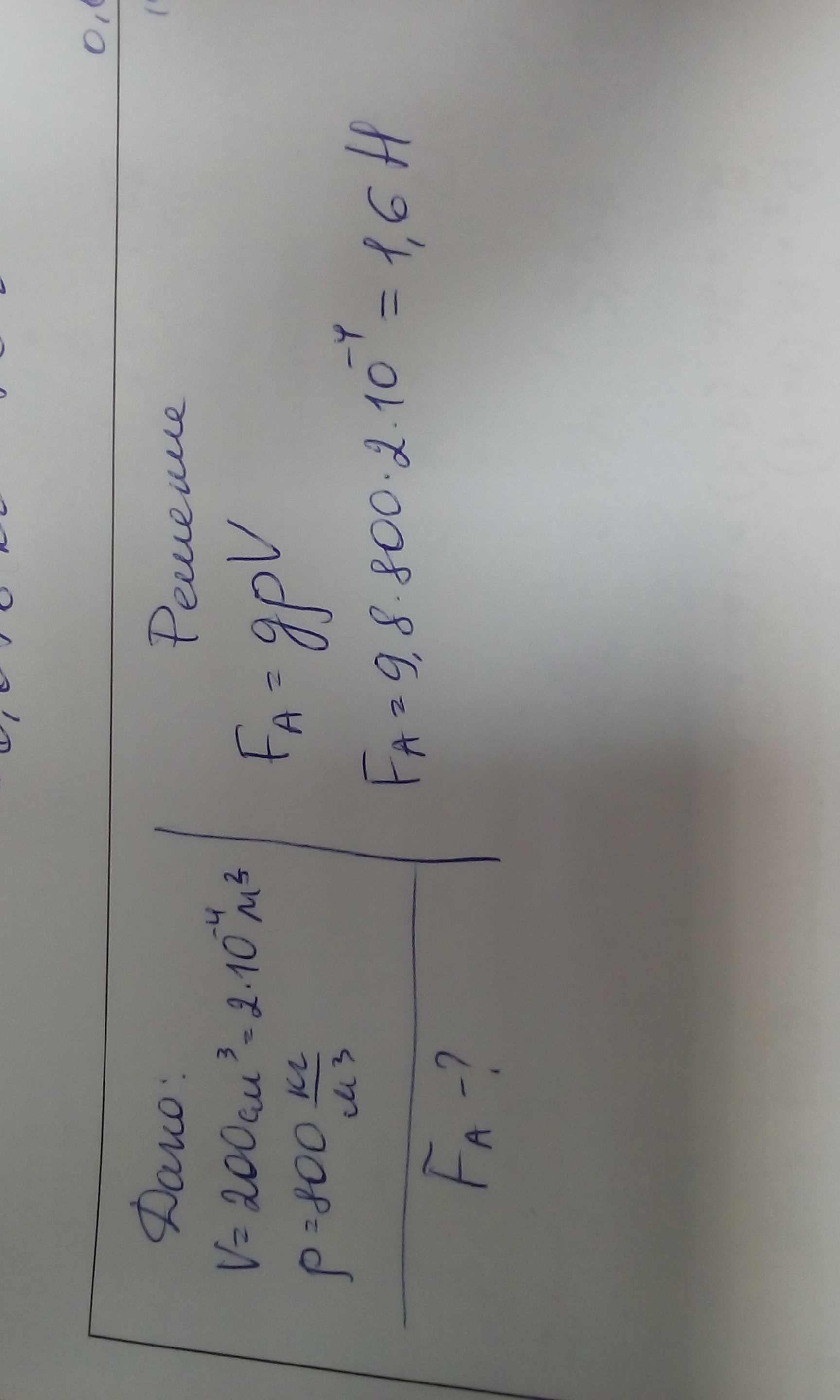 Fа=800(кг/м³)*10*0,0002(м³)=1,6 H