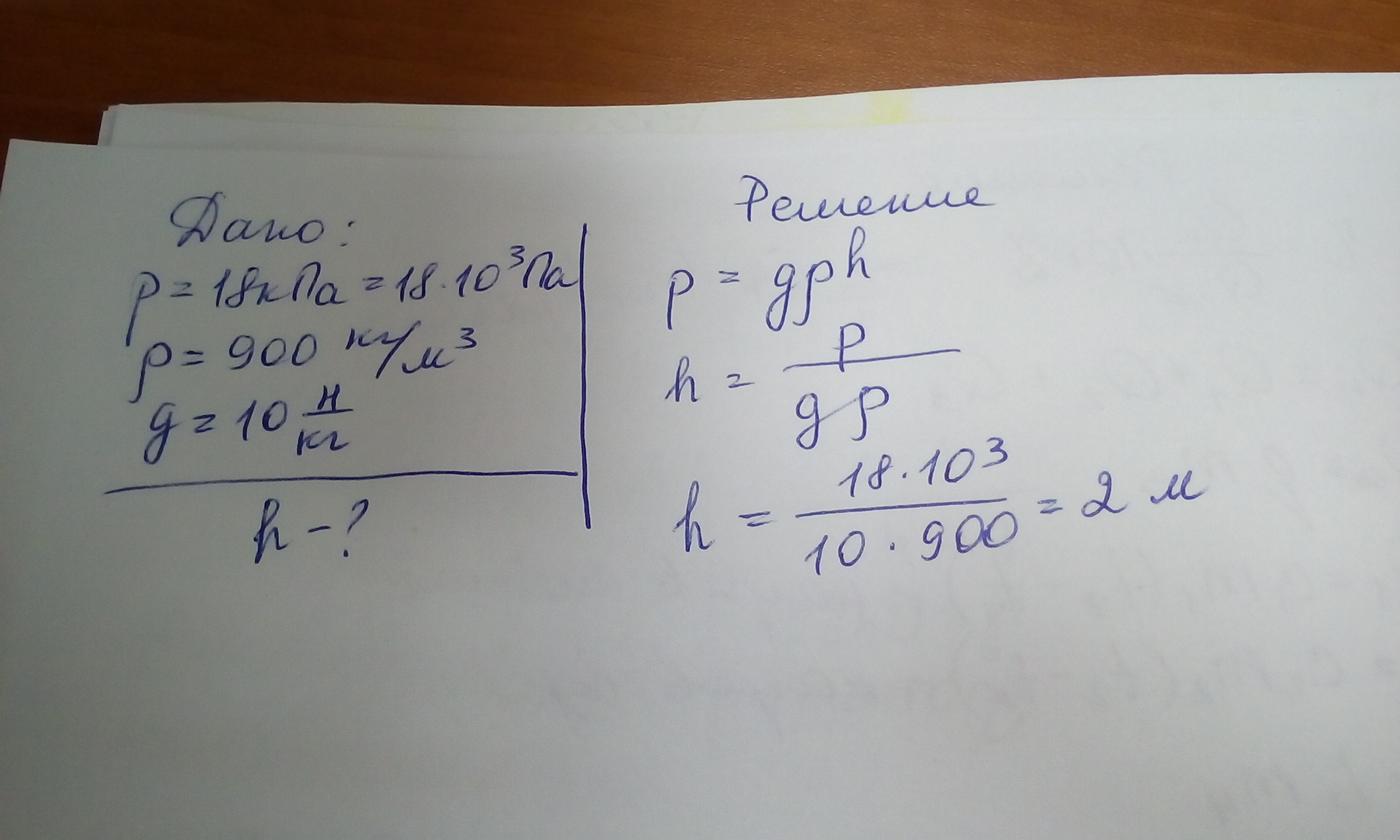 найдите какой высоты столб масла оказывает давление p=18кПа.Плотность масла p=900кг/м.Коэффициент g принять равным 10 Н/кг