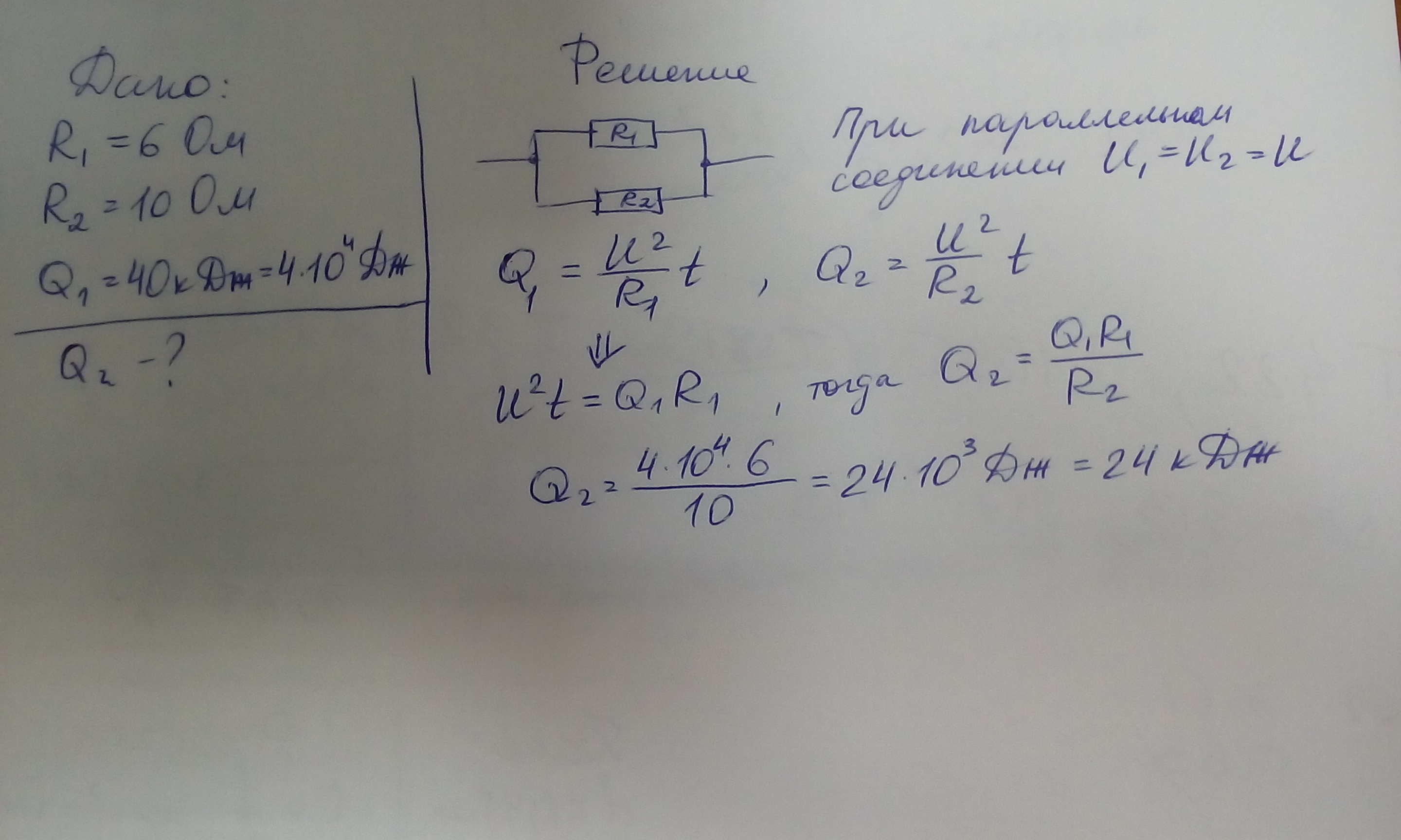 Два провода с сопротивлением 6 ОМ и 10 ОМ соединены параллельно.При прохождении через них тока в проводнике с меньшим сопротивлением выделяетмя 40 кДЖ теплоты.Определите в кДж количество телоты,выделяющиеся за это же время в другом проводнике.