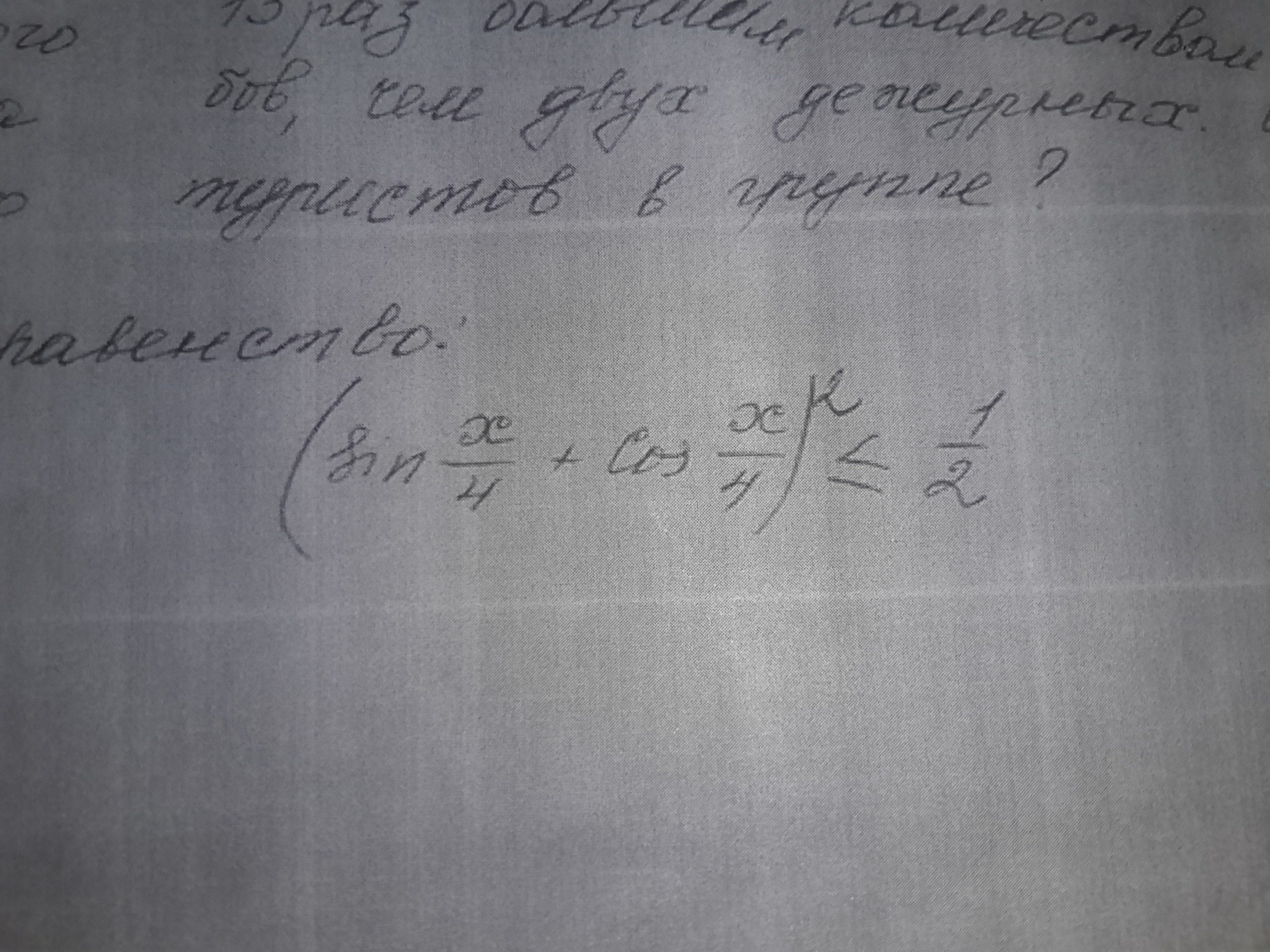 (sin frac{x}{4} +cosfrac{x}{4} )^2 leq 0.5\ \ 1+2sinfrac{x}{4} cosfrac{x}{4}  leq 0.5\ sinfrac{x}{2}  leq -0.5\ \ - frac{5 pi }{6}+2 pi k leq frac{x}{2}  leq - frac{pi}{6} +2 pi k, k in Z\ \ - frac{5 pi }{3} +4 pi k  leq x leq - frac{pi}{3} +4 pi k,k in Z
