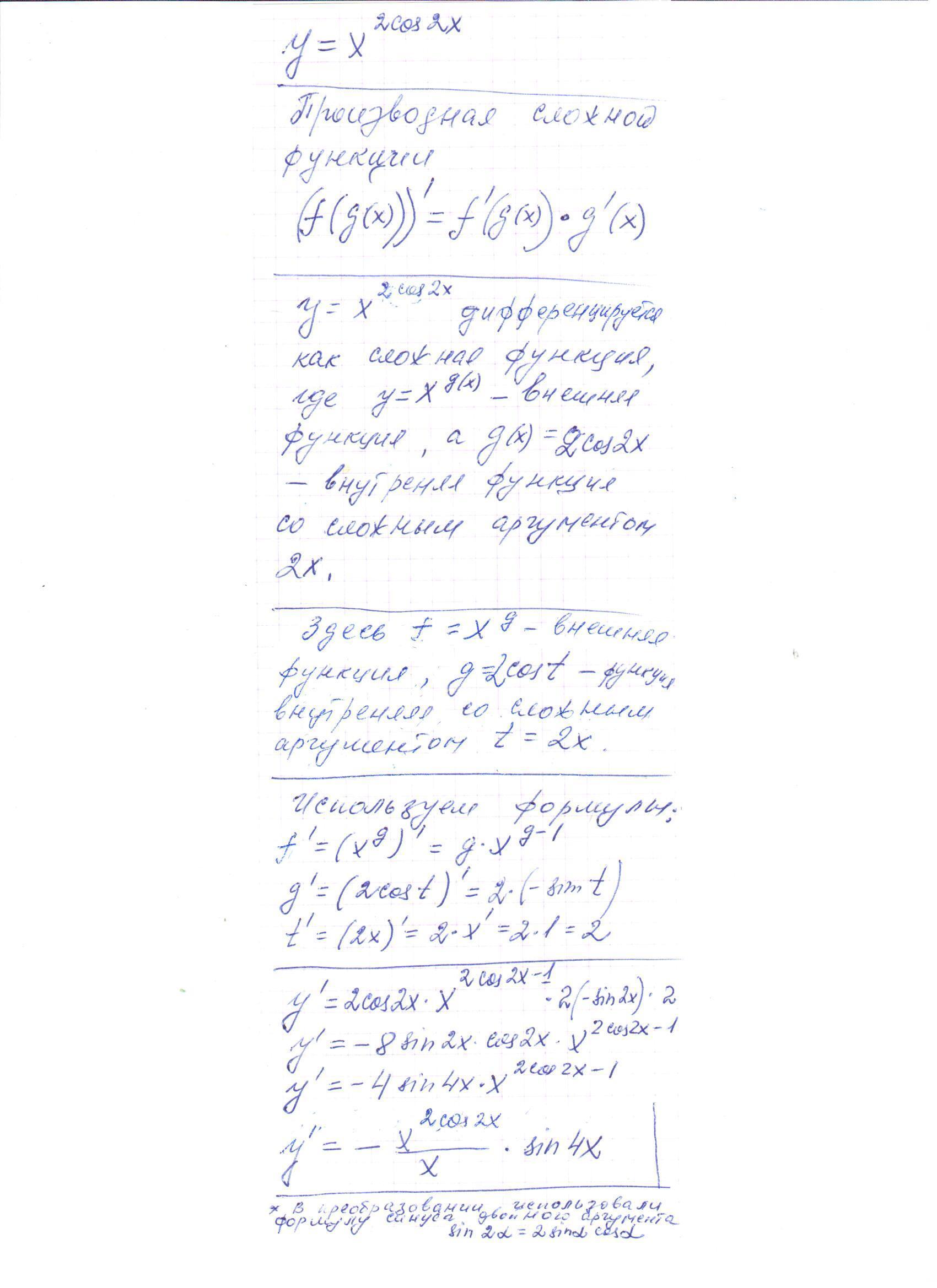 sin2x) * (2x)' = - 2sin2x. Ответ с поправкой: y' = (x^2)'*cos2x + x^2*(cos2x)' = 2х*cos2x + x^2*(- sin2x)*2 = =2х*cos2x - 2x^2*sin2x.
