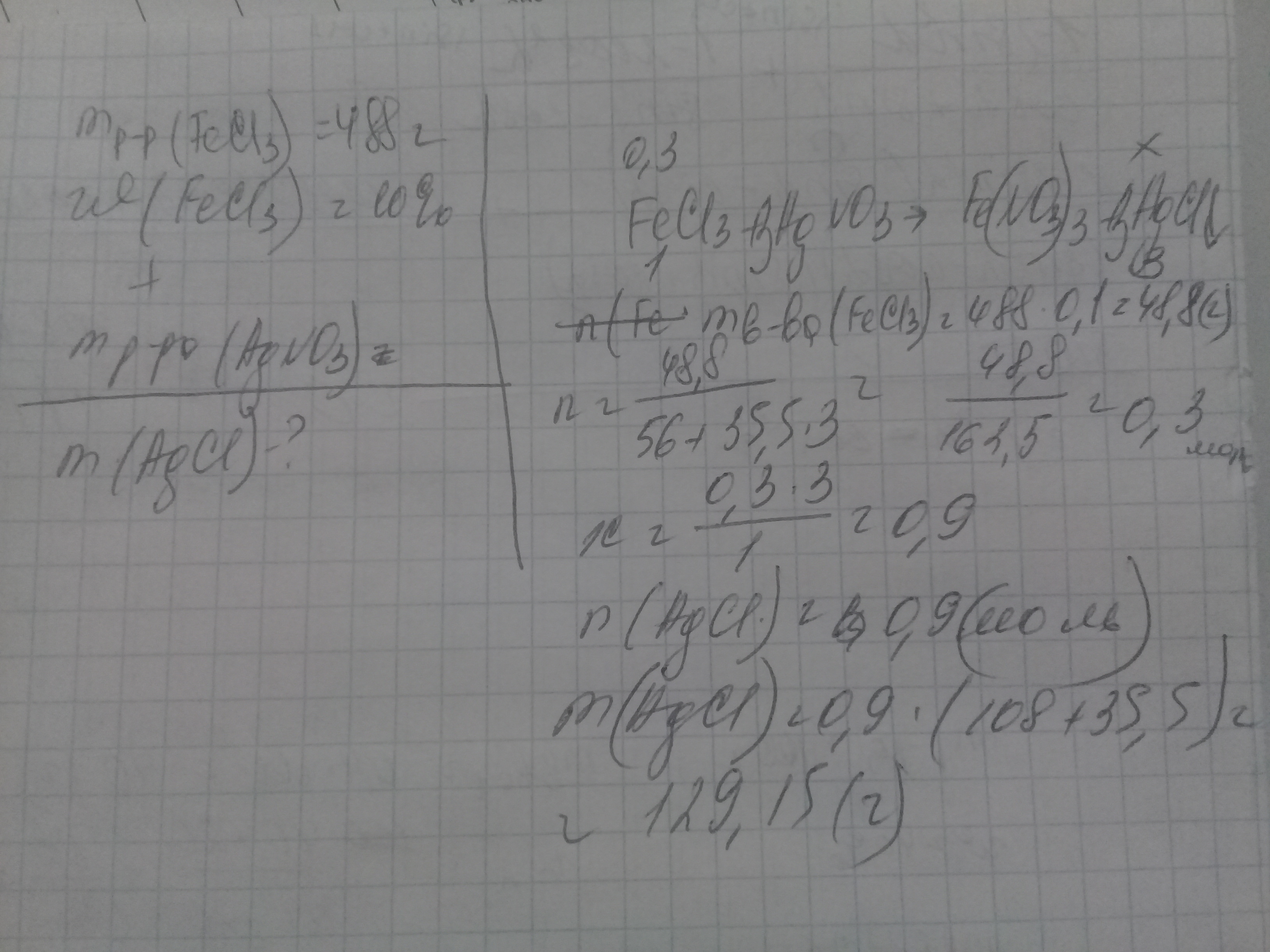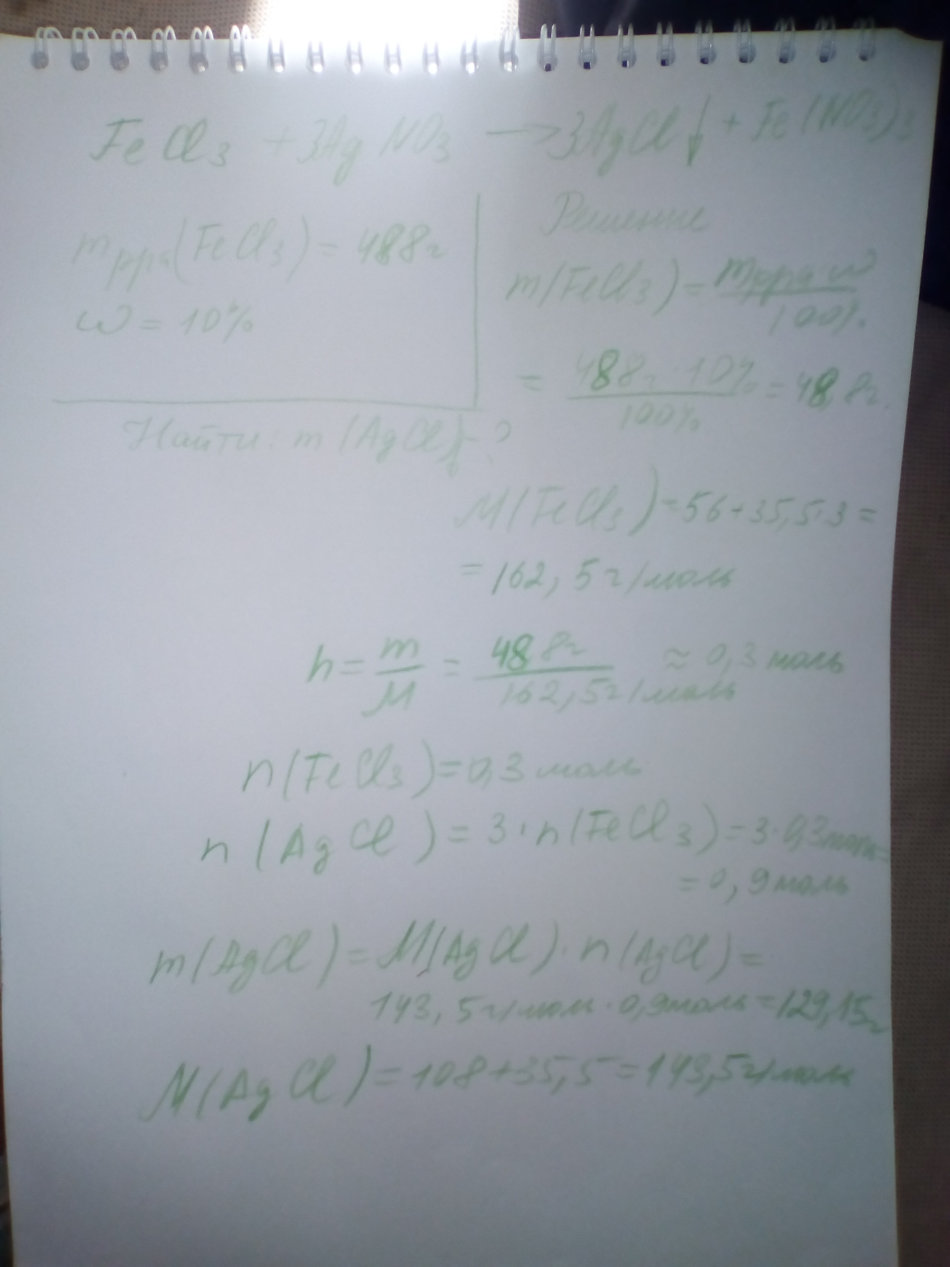 К раствору хлорида железа(III) массой 488 г и массовой долей 10% прилили избыток раствора нитрата серебра. Вычислите массу образовавшегося осадка.