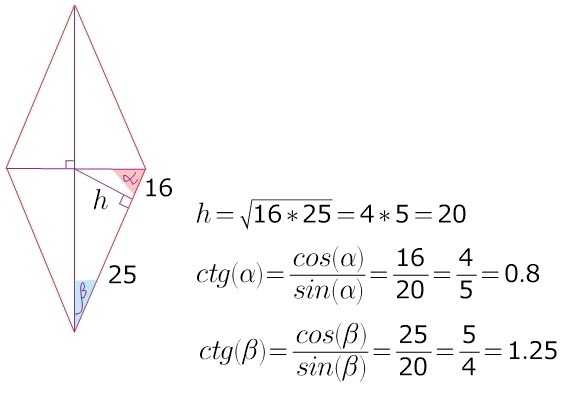 Из точки пересечения диагоналей ромба проведен перпендикуляр,который делить сторону ромба на сярэдзни 16 и 25 см . Знайсти катангес утворагана стороной диагонали ромба