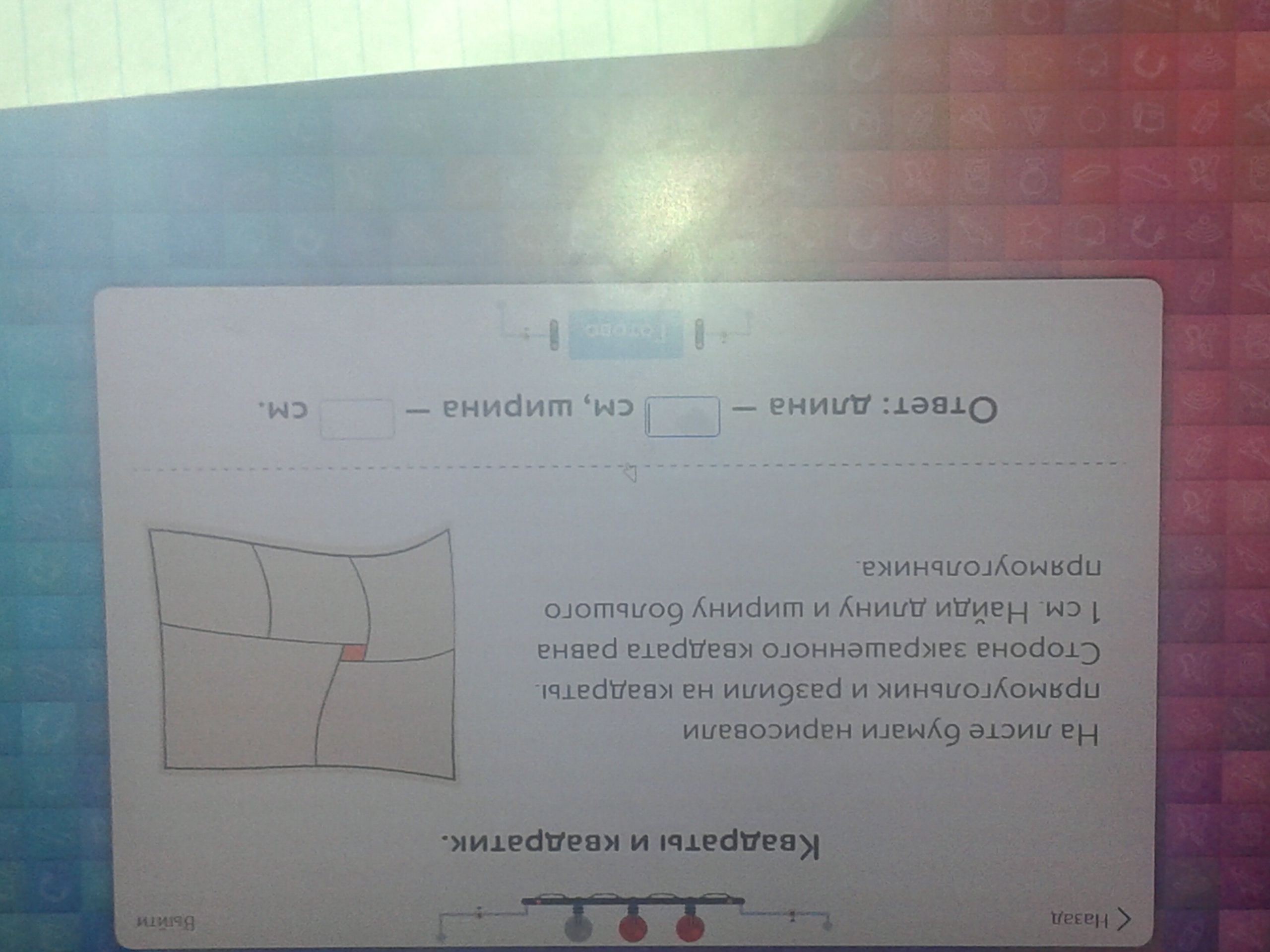 На листе бумаги нарисовали прямоугольник и разбили на квадраты. Сторона закрашенного квадрата равна 1см. Найди длину и ширину большого прямоугольника