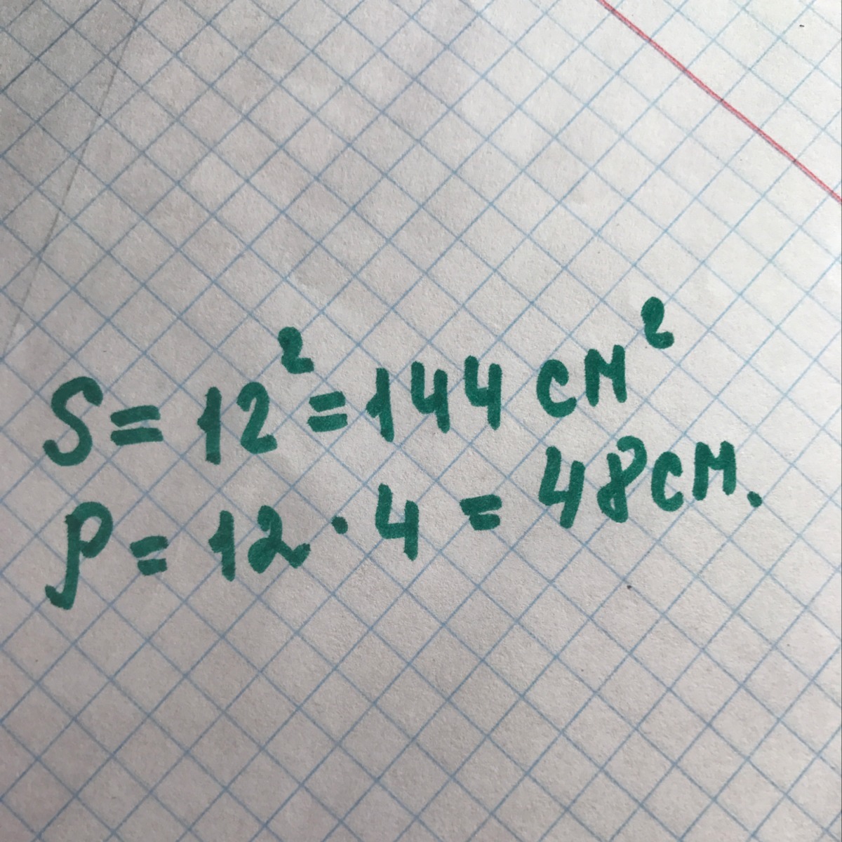 P=12+12+12+12=48(см); S=12*12=144(см^2).