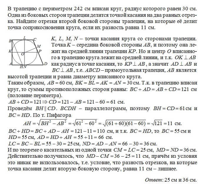 в трапецию с периметром 242 см вписан круг, радиус которого равен 30см.Одна с боковых сторон трапеции делится точкой касания на два равных отрезка. Найдите отрезки второй боковой стороны трапеции, на которые делится точка соприкосновения круга, если их разность равна 11 см