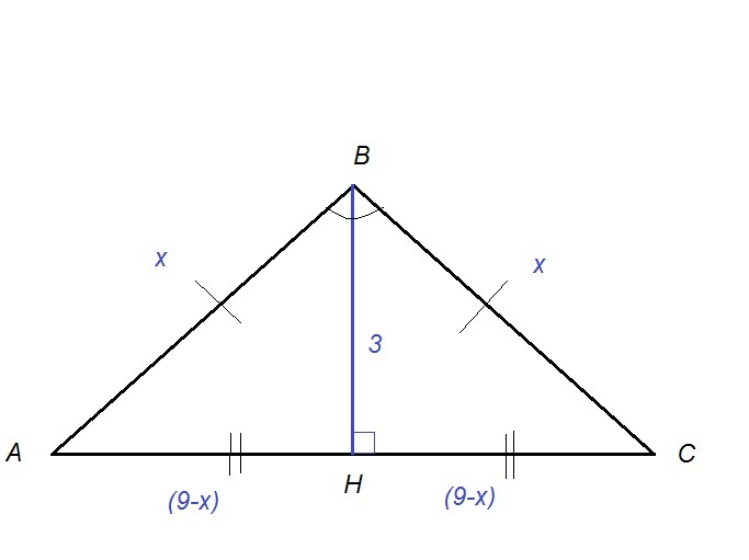 АС = 18 - 2*х = 2*(9-х) (см) ⇒ АН=НС = 9 - х (см)