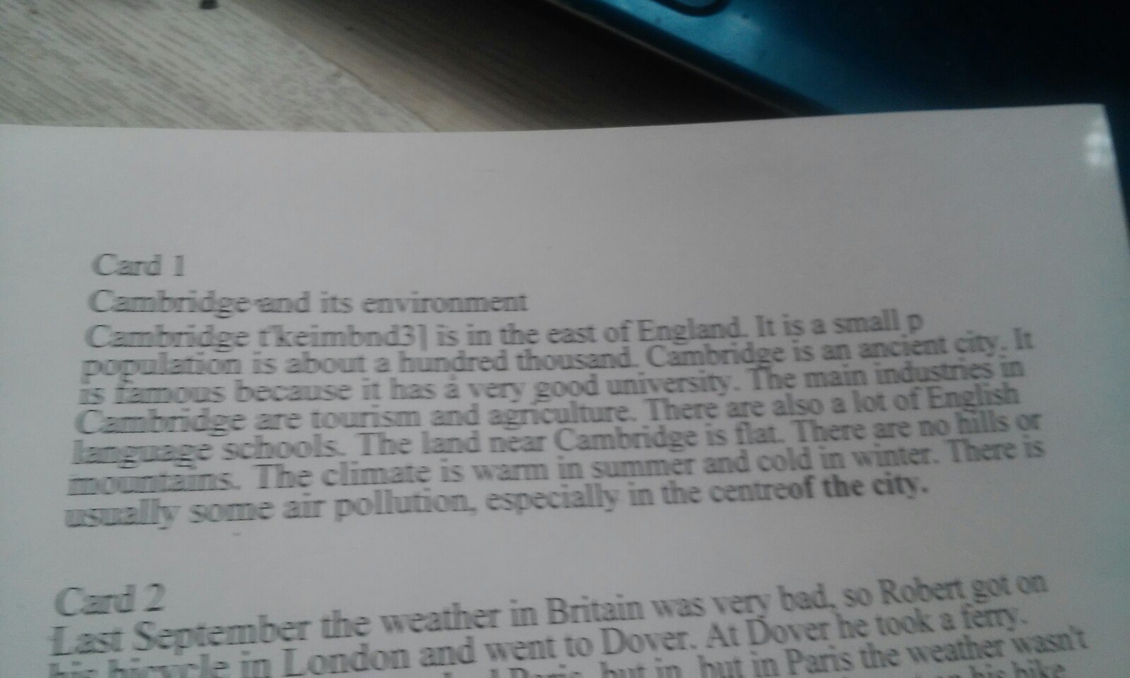 Кембридж находится на востоке Англии. Население его около 100 000 человек. Кембридж - это древний город. Он знаменит тем, что там есть очень хороший университет. Самые главные отрасли - туризм и сельское хозяйство. также там много языковых школ, где учат английскому. Земля вокруг Кембриджа - плоская. Нет там ни холмов, ни гор. Климат тёплый летом и холодный зимой. Присутствует также некоторое загрязнение воздуха, особенно в центре города.