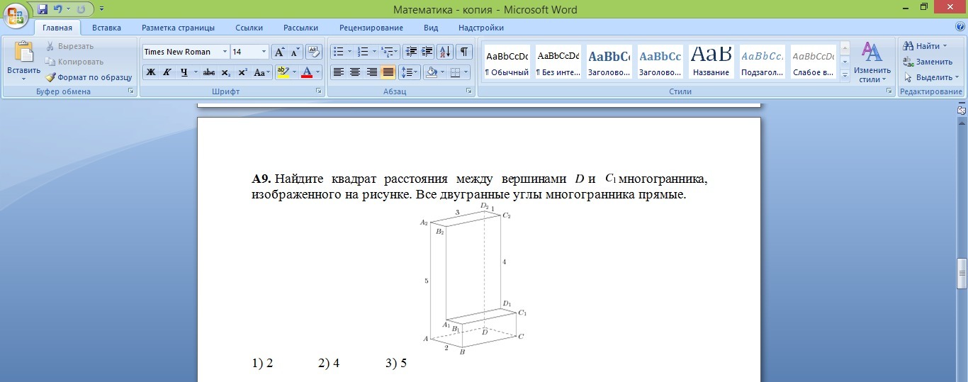 Найдите квадрат расстояния между вершинами и многогранника, изображенного на рисунке. Все двугранные углы многогранника прямые.