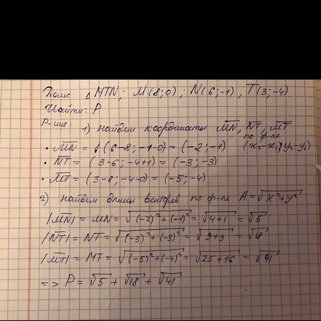 Дано: треугольник MTN. М(8;0) N(6;-1) T(3;-4). Найти: P треугольника MTN помогите пожалуйста если не трудно!