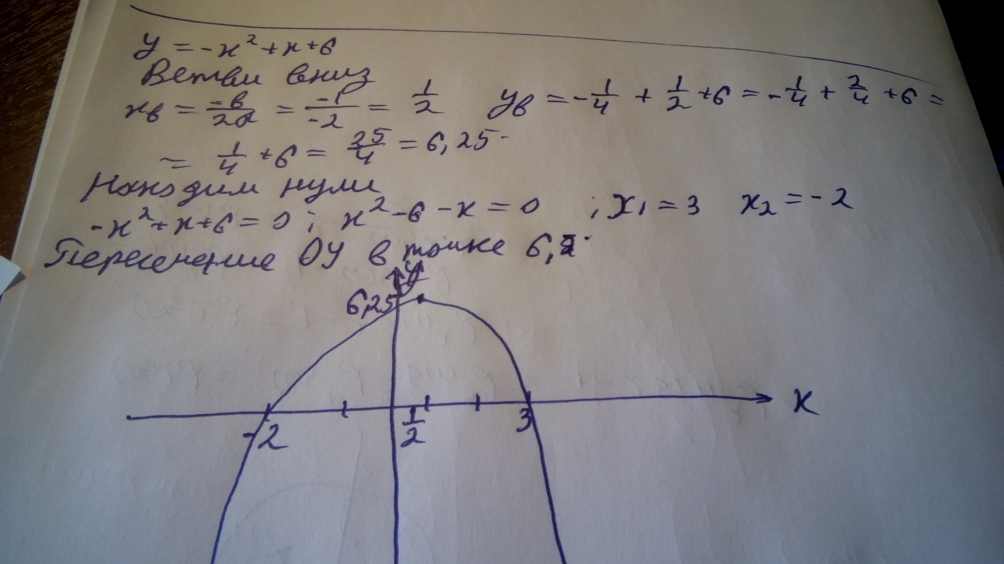 Построить график функции : у=-х2+х+6 Помогите пожалуйста ,если можно начертите на листочке ,буду очень благодарна ))