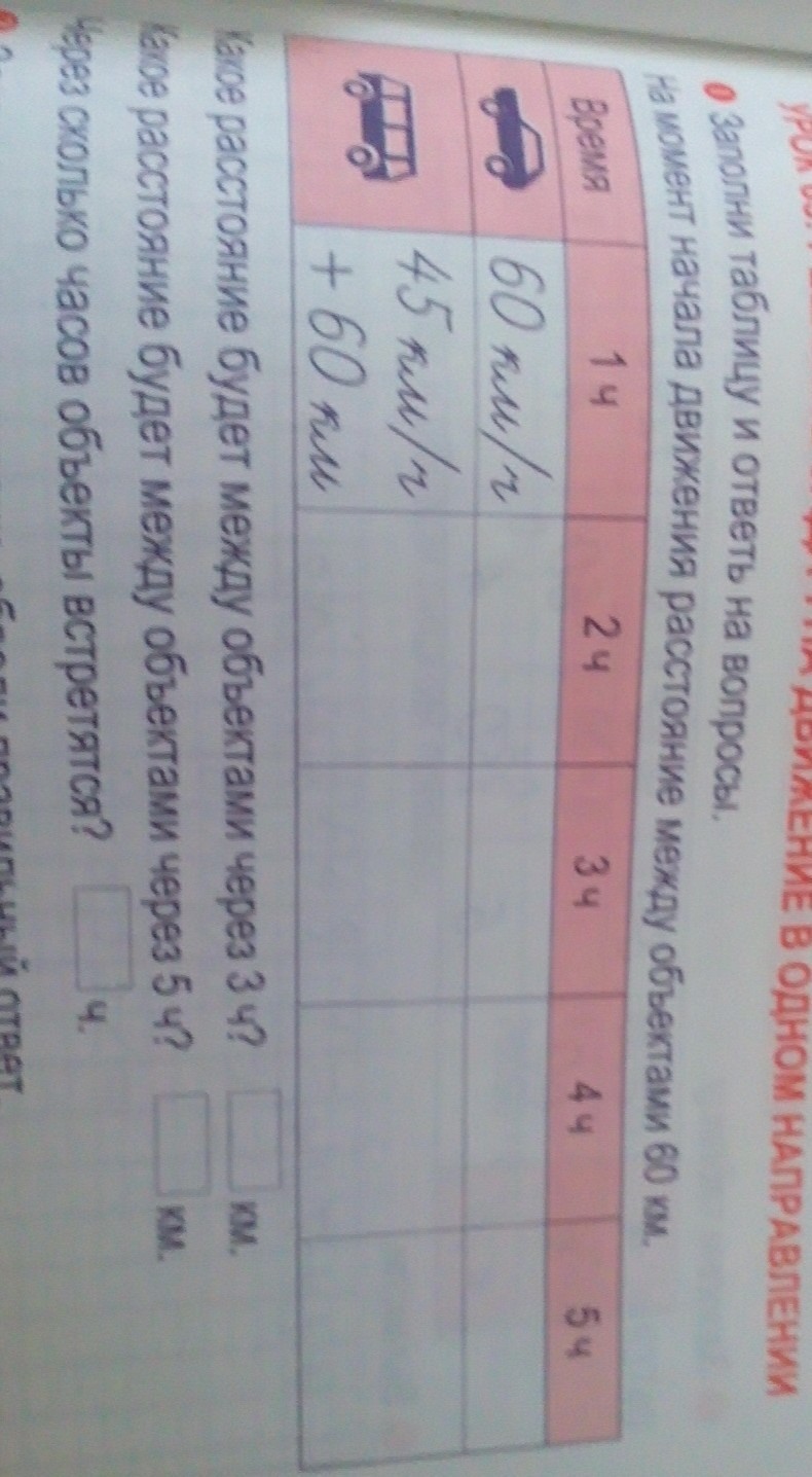 заполни таблицу и ответь на вопросы. На момент начала движения растояние между объектами 60 км