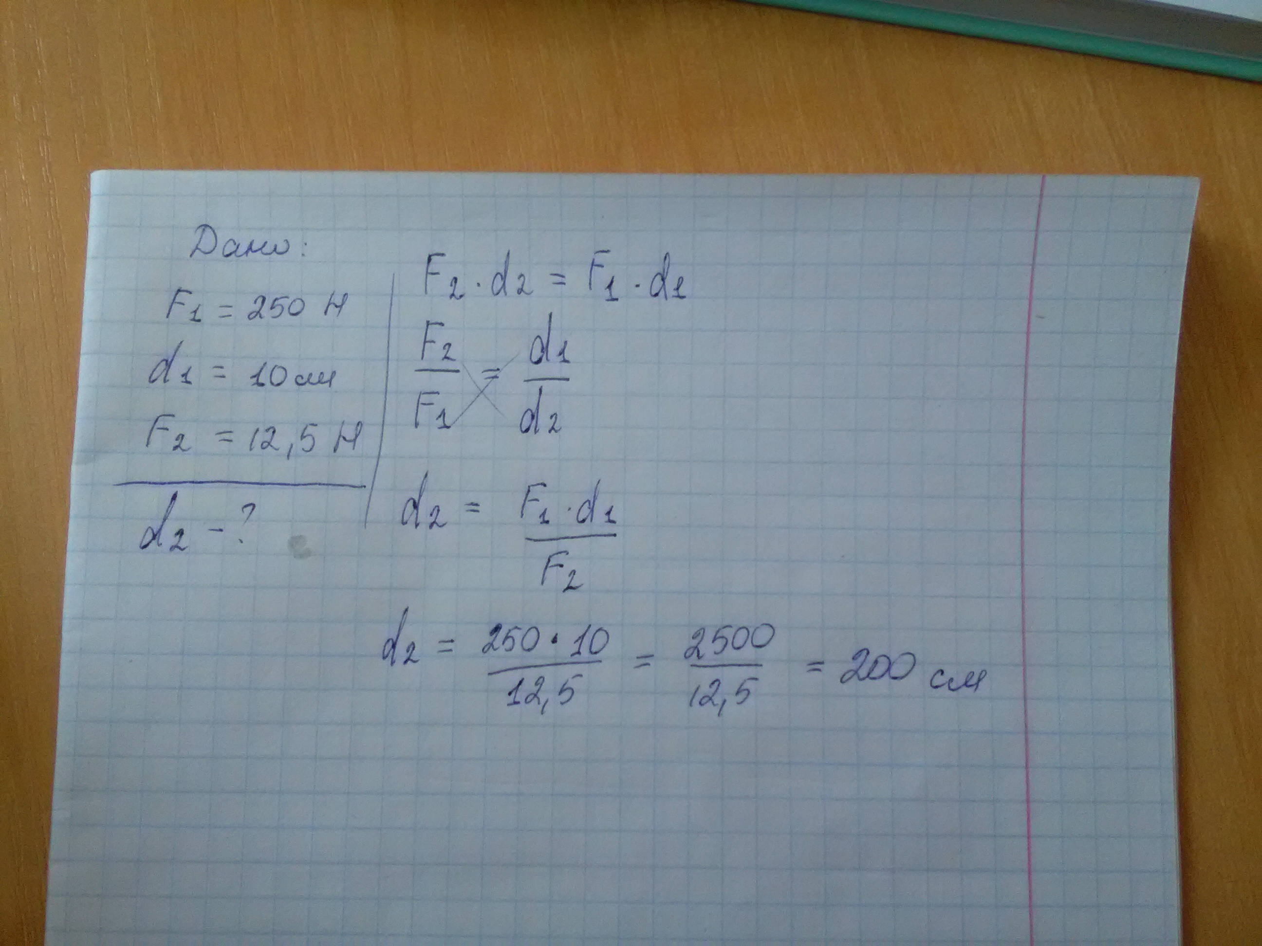 длина маленького плеча рычага 10 см. на малое плечо действует сила 250 Н , а на большое плечо 12,5 Н. определите размеры длинного плеча