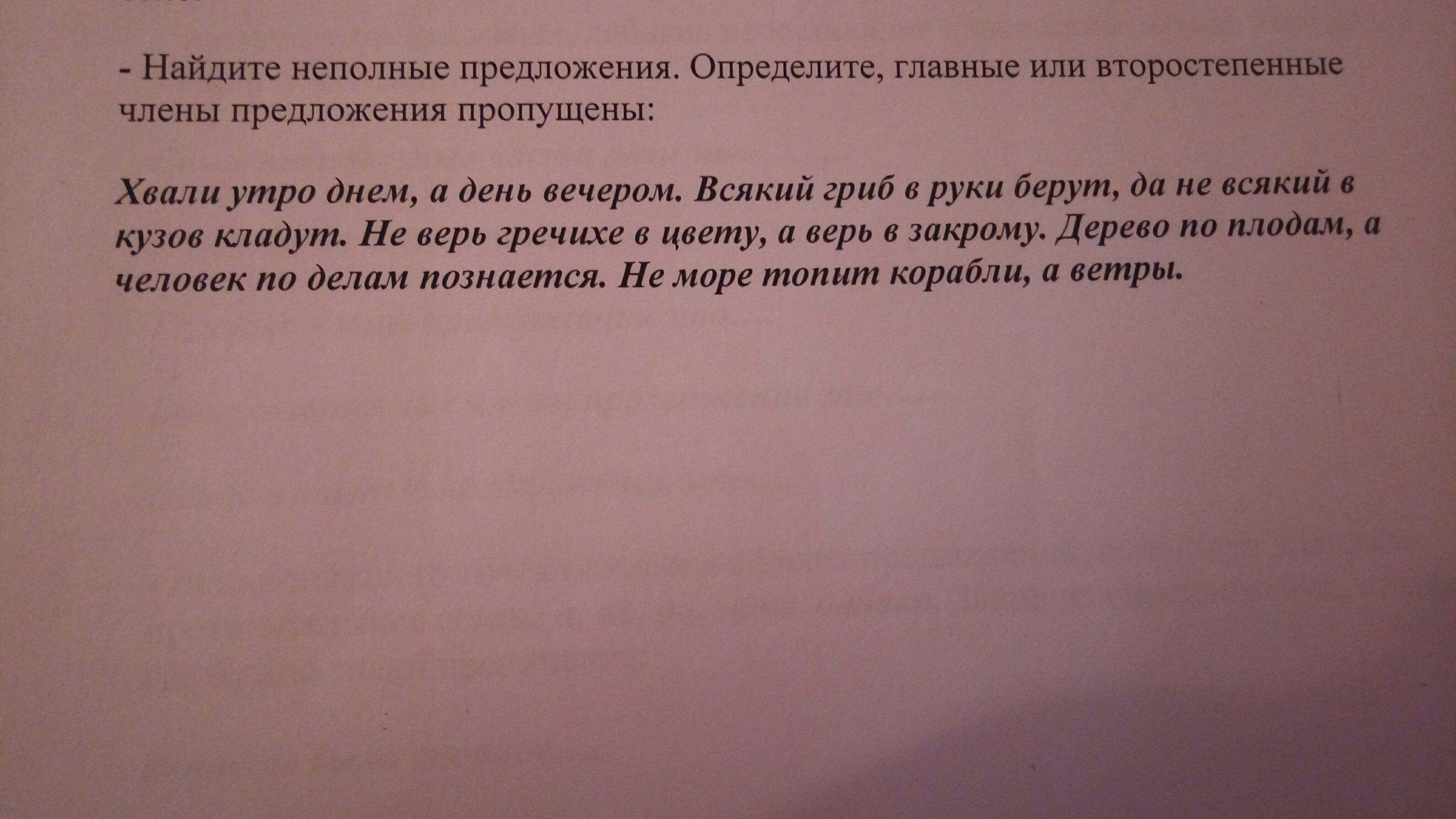 Найдите неполные предложения. Определите, главные или второстепенные члены предложения пропущены: