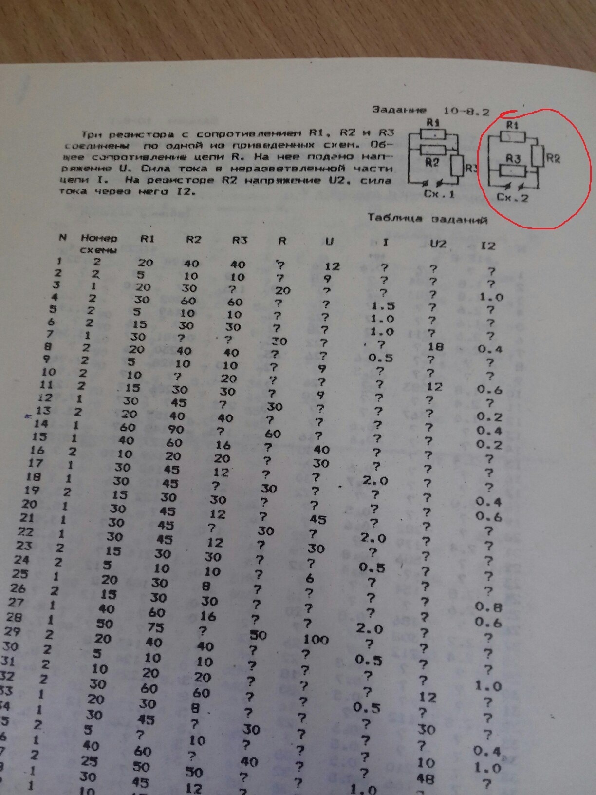 Три резистора с сопротивлениями R1, R2, R3 соединенны по схеме см. фото. Общее сопротивление цепи R. На нее поданно напряжение U Сила тока в неразветвленной части цепи I На резисторе R2 напряжение U2 сила тока через него I2. Надо НАЙТИ R, I, U2, I2 если R1=5 Ом, R2=10 ОМ, R=10 OM, U=9 пожалуйста поподробней