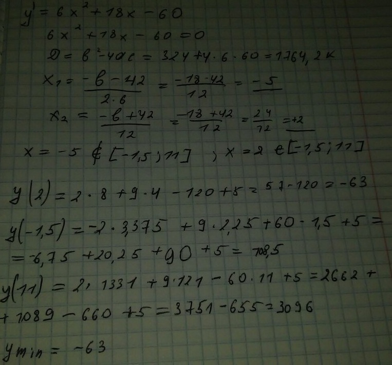 Найдите наименьшее значение функции y=2x^3+9x^2-60x+5 на отрезке [-1,5;11]. Помогите пожалуйста!
