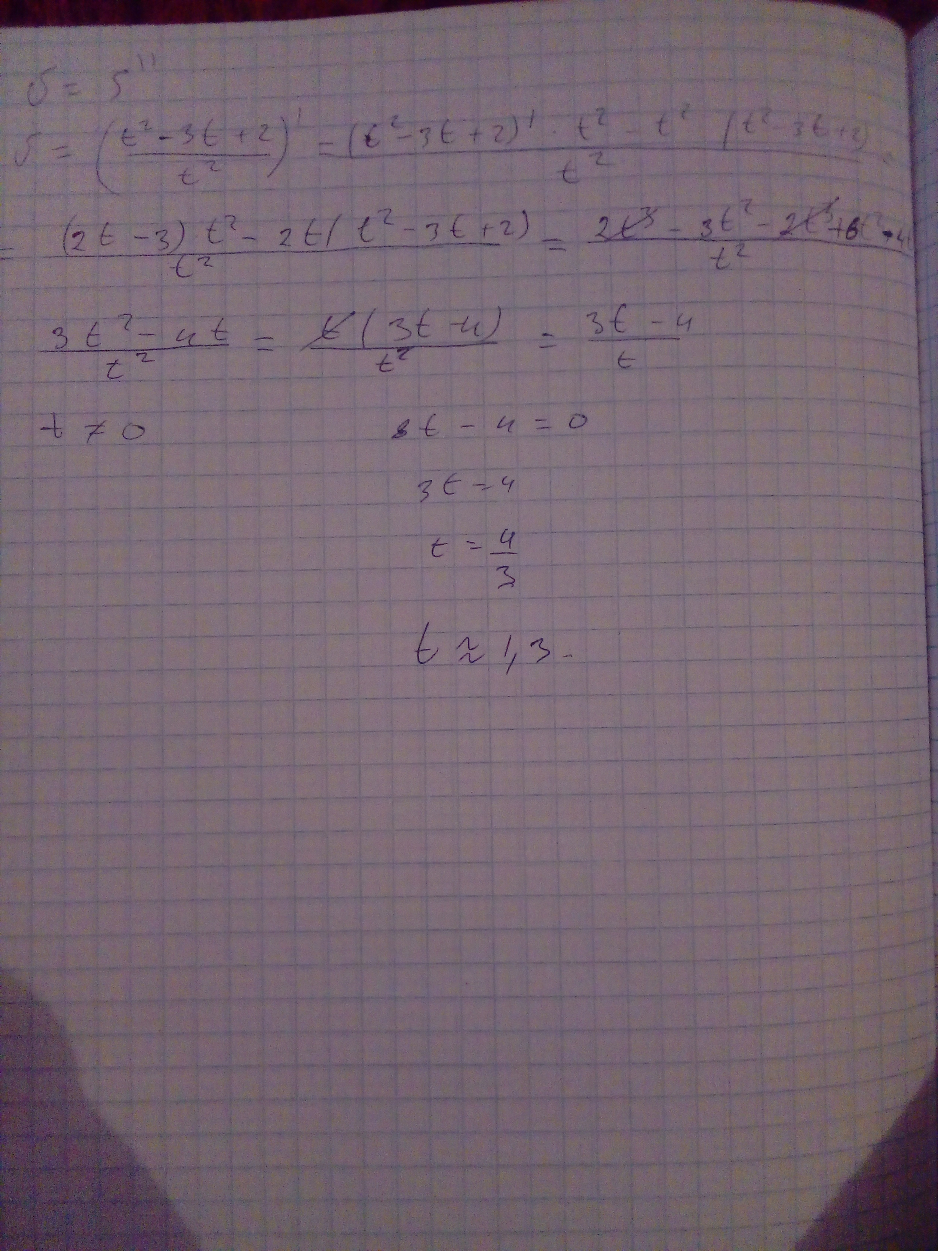 Поэтому v=S'(t)=(3t-4)/t^3. Момент, когда точка остановится, это v=0.