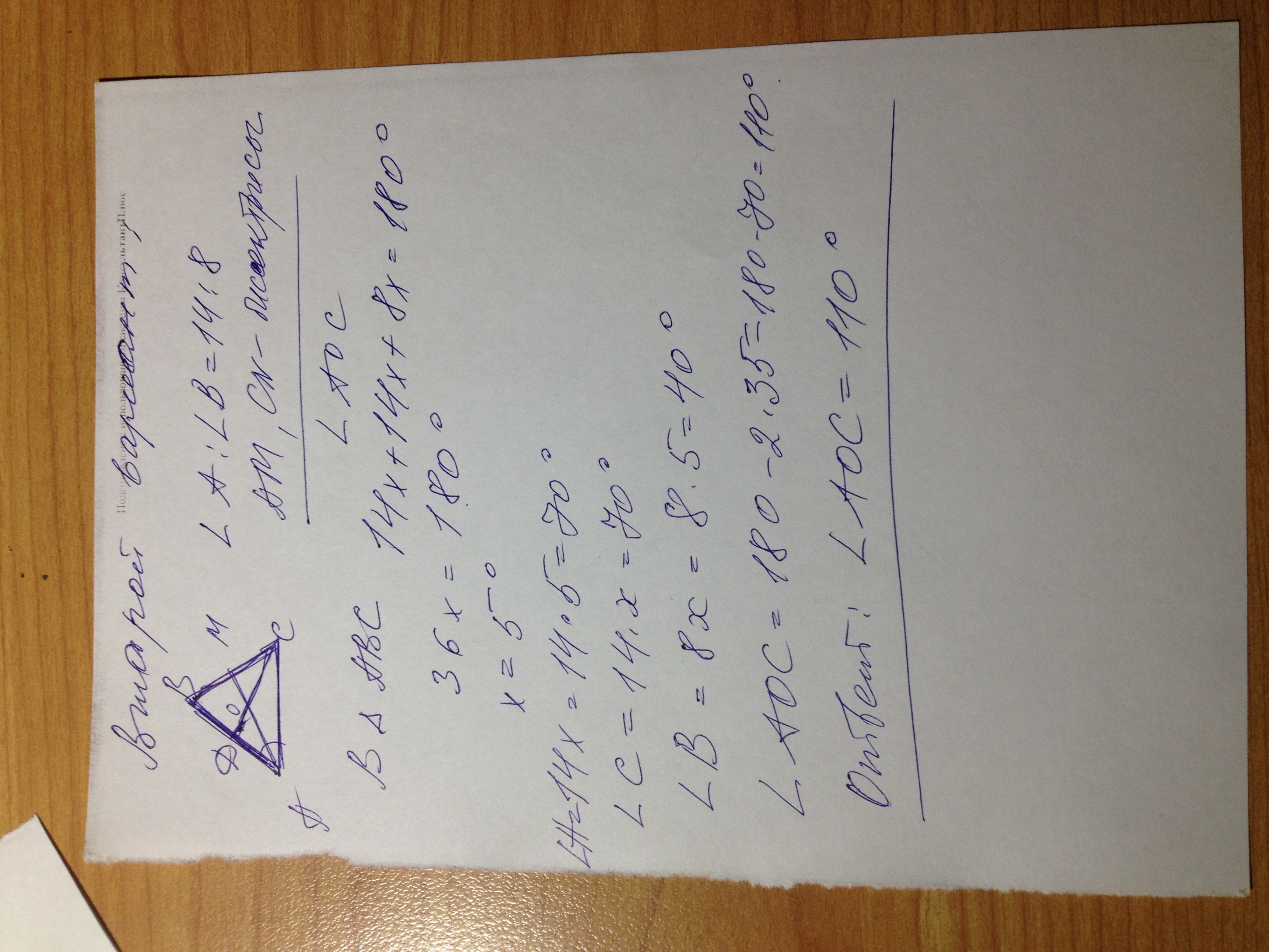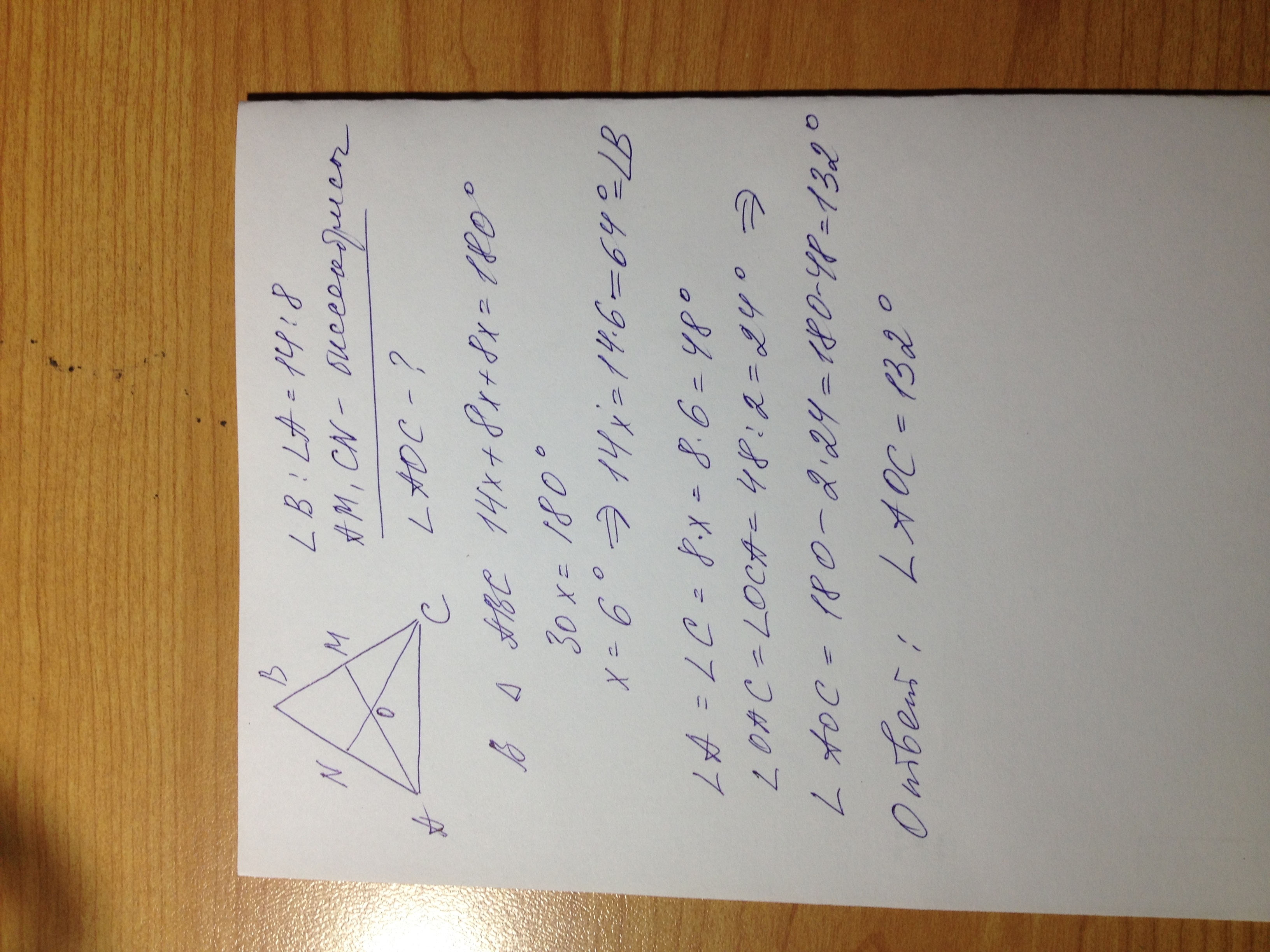 Два угла равнобедренного треугольника пропорциональны числам 14 и 8. Найдите угол между биссектрисами равных углов.