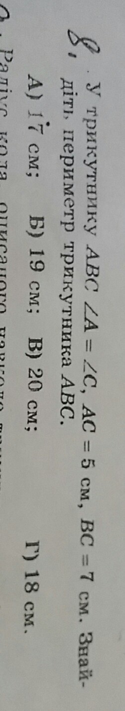 Ответ под буквой Б, так как раз углы при основании равны, то треугольник равнобедренный. 7+7+5=19 см